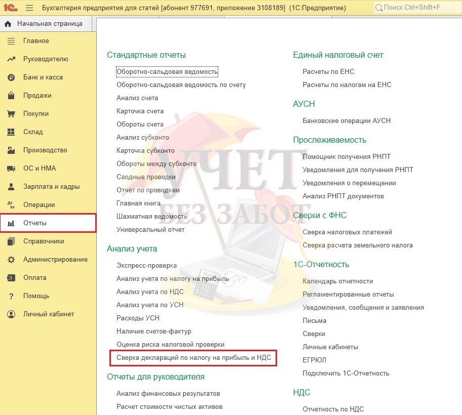 Итак, находится такой отчет в разделе меню «Отчеты» и называется «Сверка деклараций по налогу на прибыль и НДС».