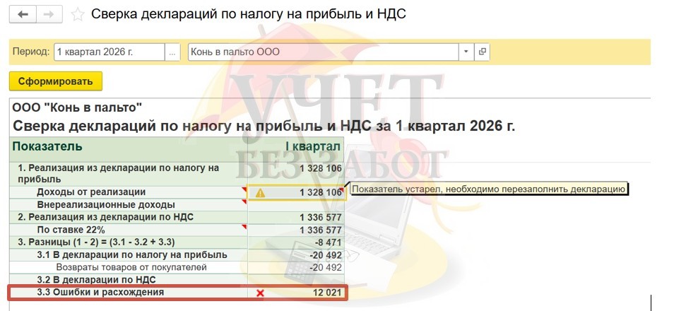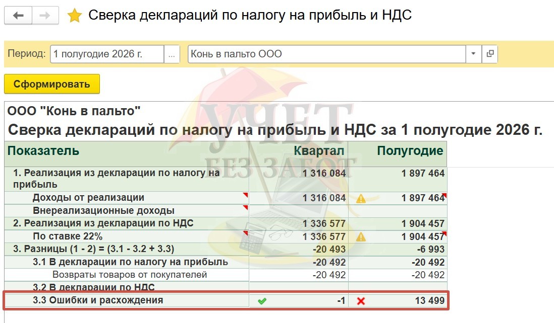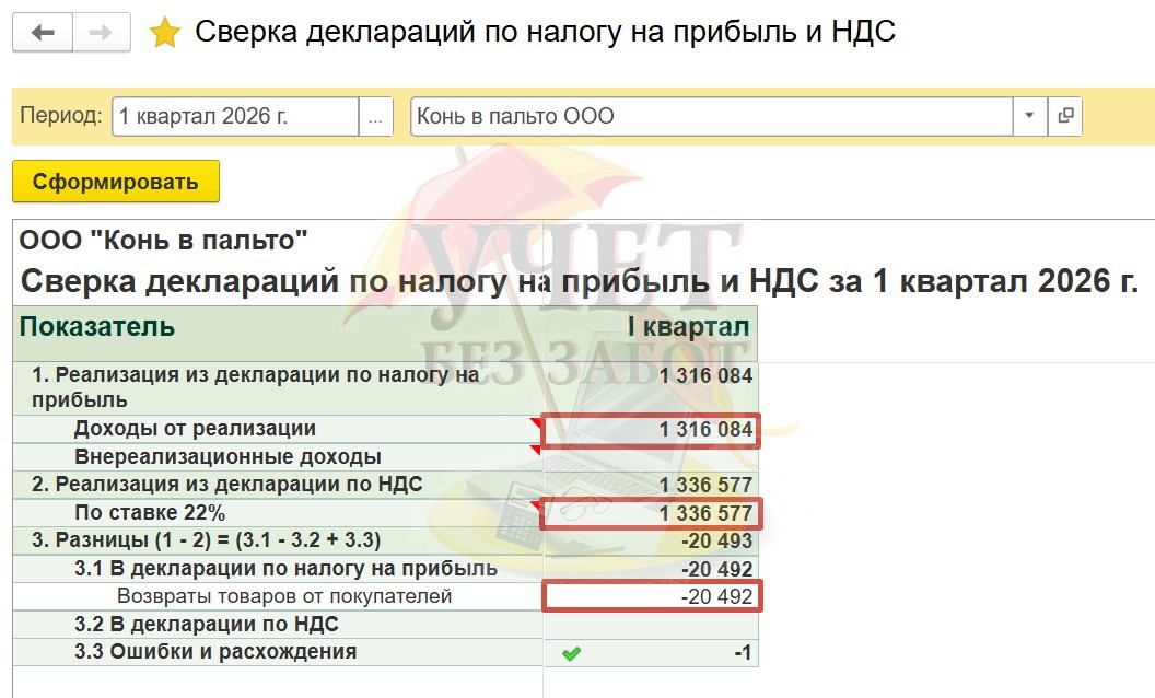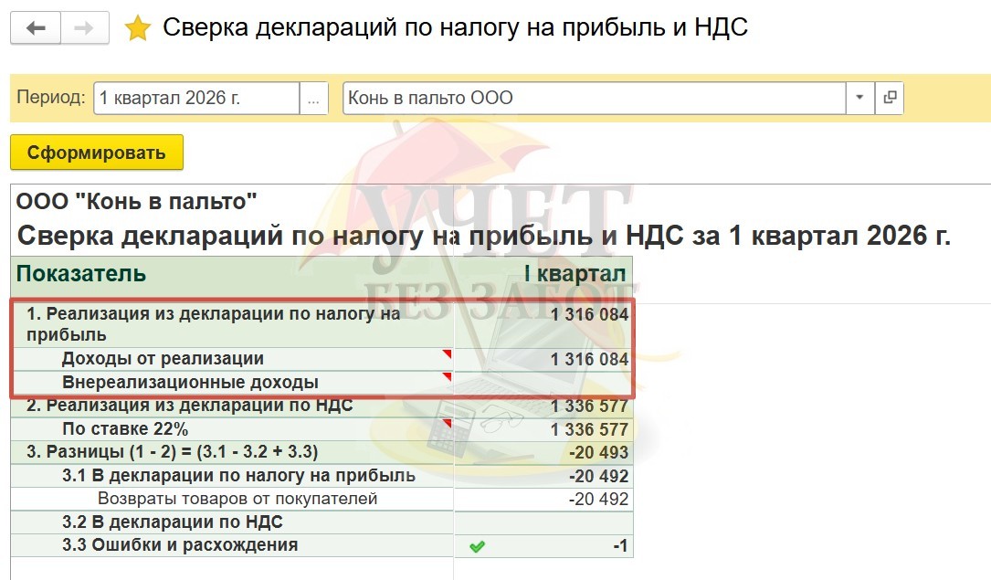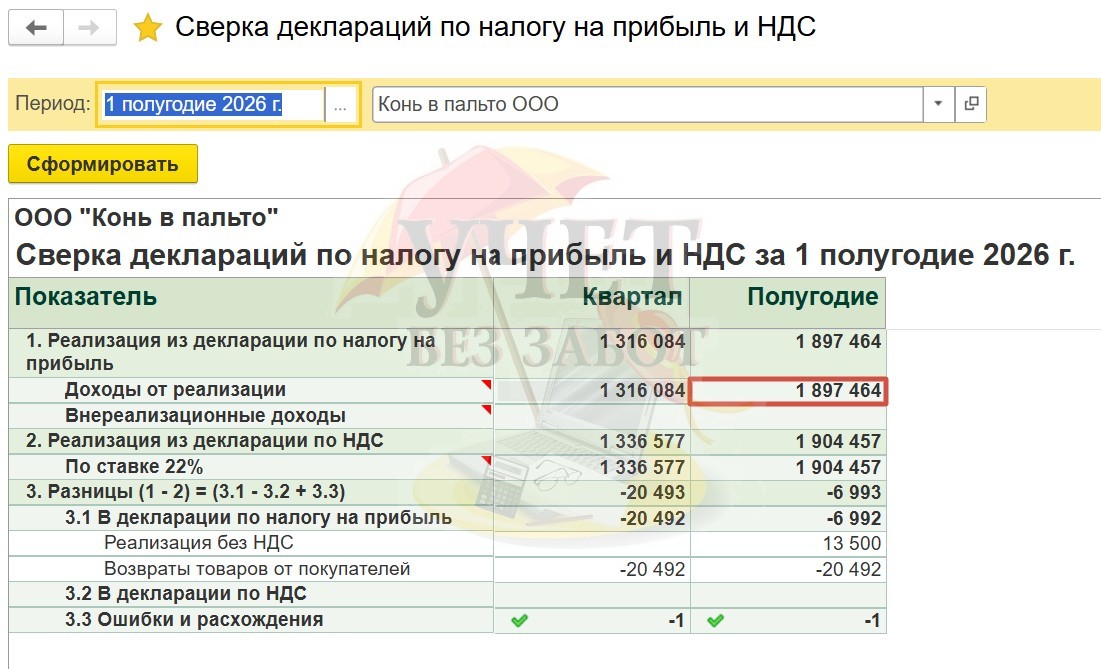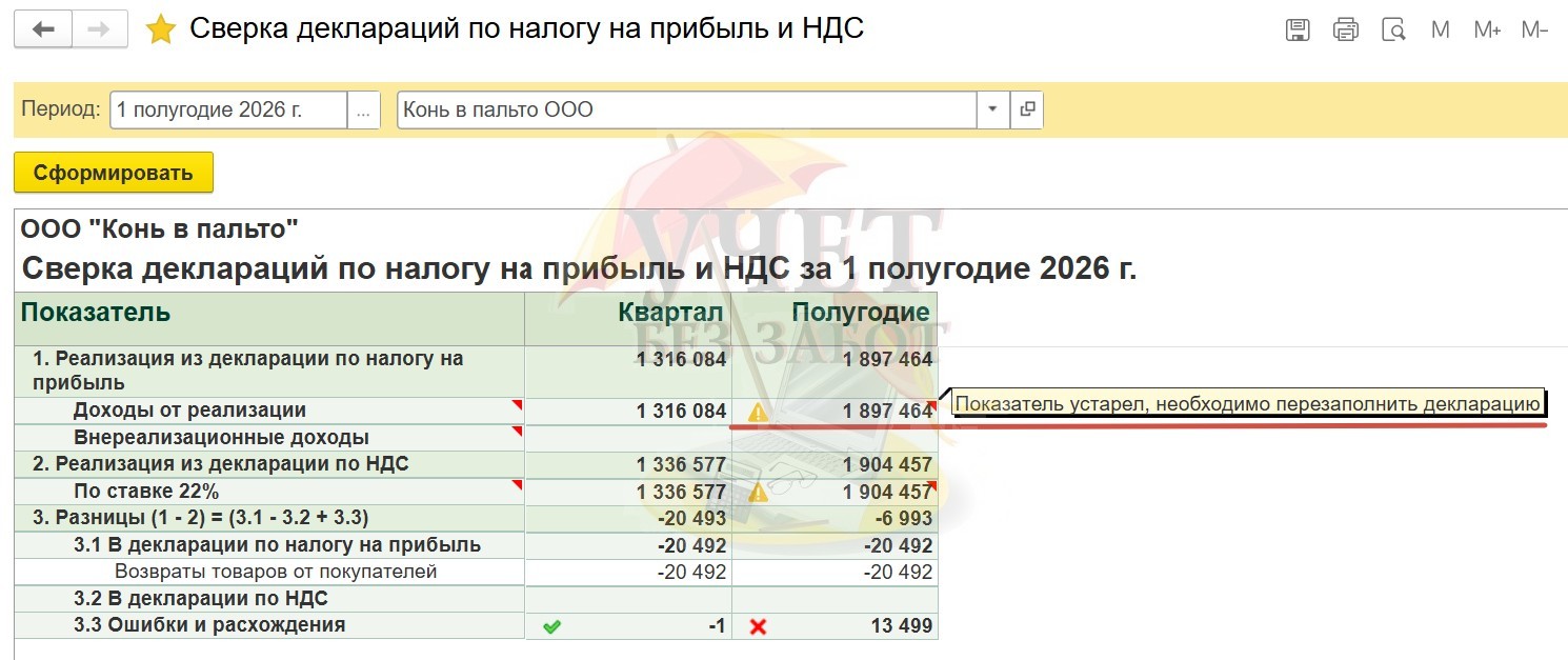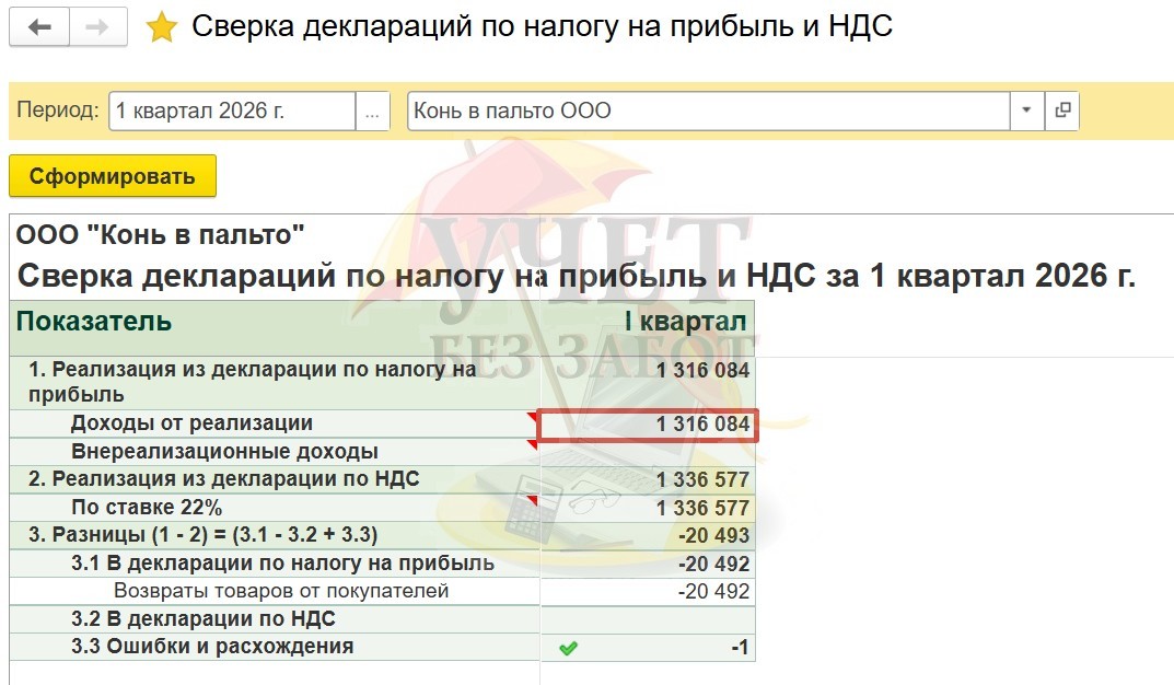 Данный отчет автоматически производит сверку выручки от реализации на основании заполненных деклараций по налогу на прибыль и НДС.