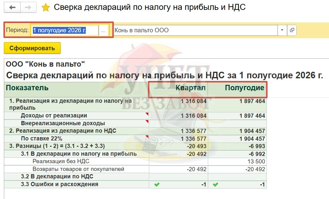 Если же мы хотим произвести сверку деклараций за полугодие, тогда программа выведет данные как за 1 квартал, так и за полугодие.