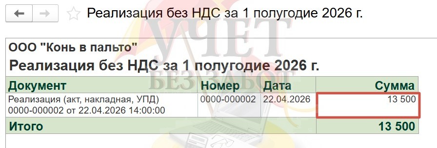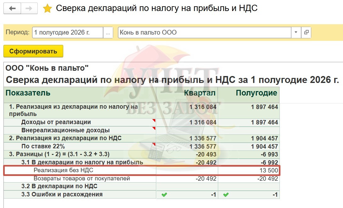 Мы видим, что в нашем примере появилась еще одна разница по данным во втором квартале, вызванная реализацией без НДС.