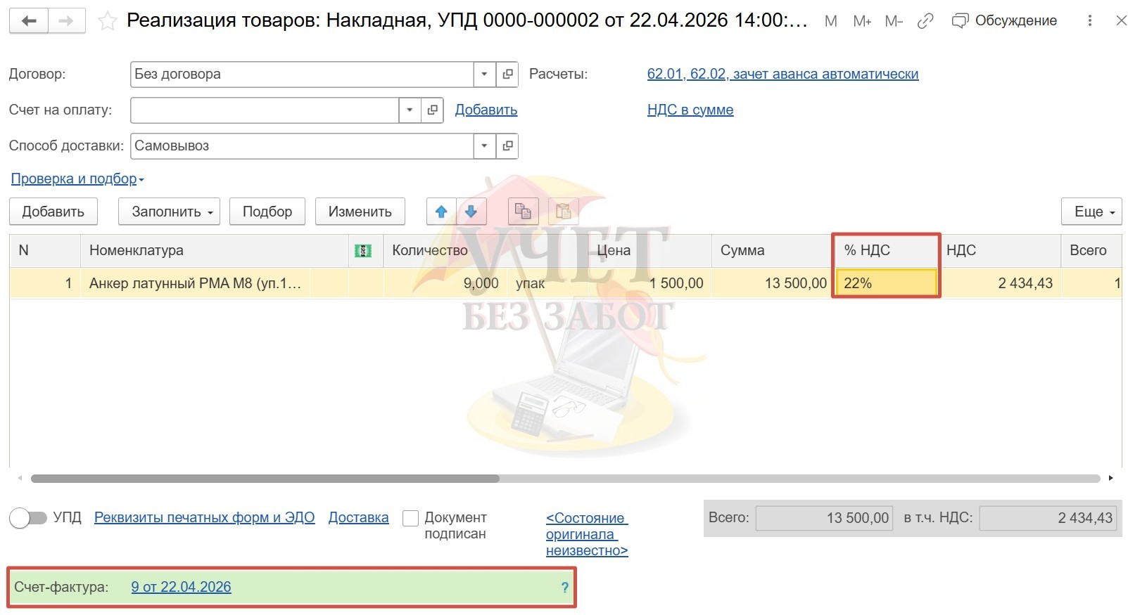 В нашем примере это ошибка. Не верно указана ставка налога и не выписан счет-фактура.