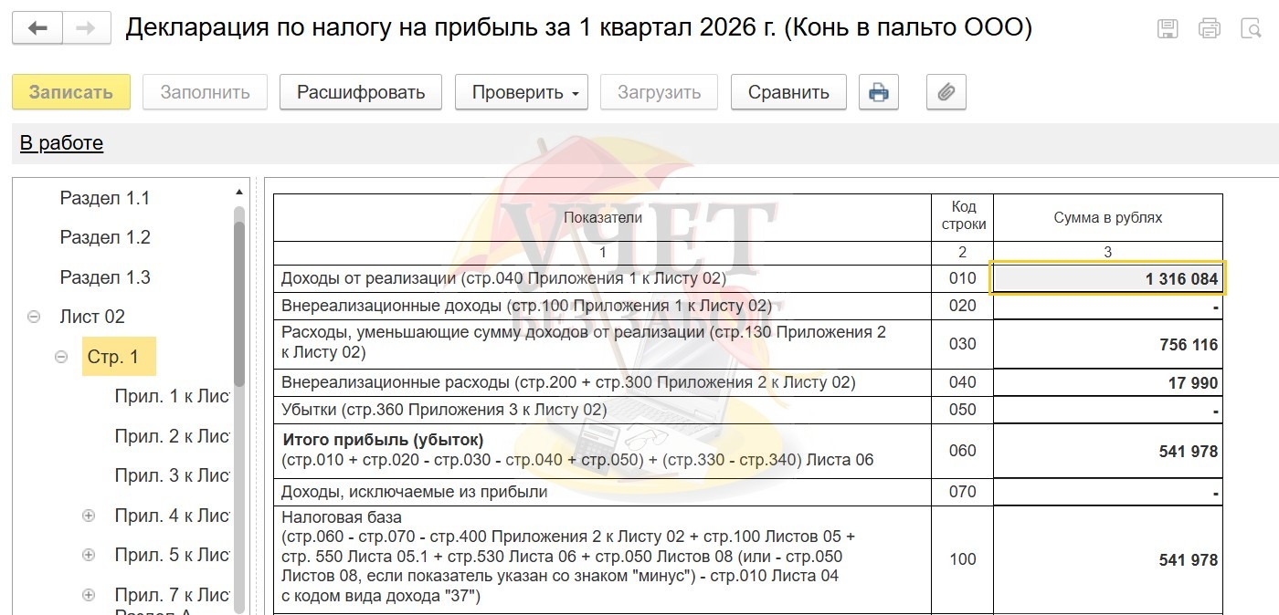 Так, например, если перейти по значению поля «Доходы от реализации», то попадём в декларацию по налогу на прибыль, а именно в строку 010 Листа 02. При этом программа подсветит строку, на которую ссылается.