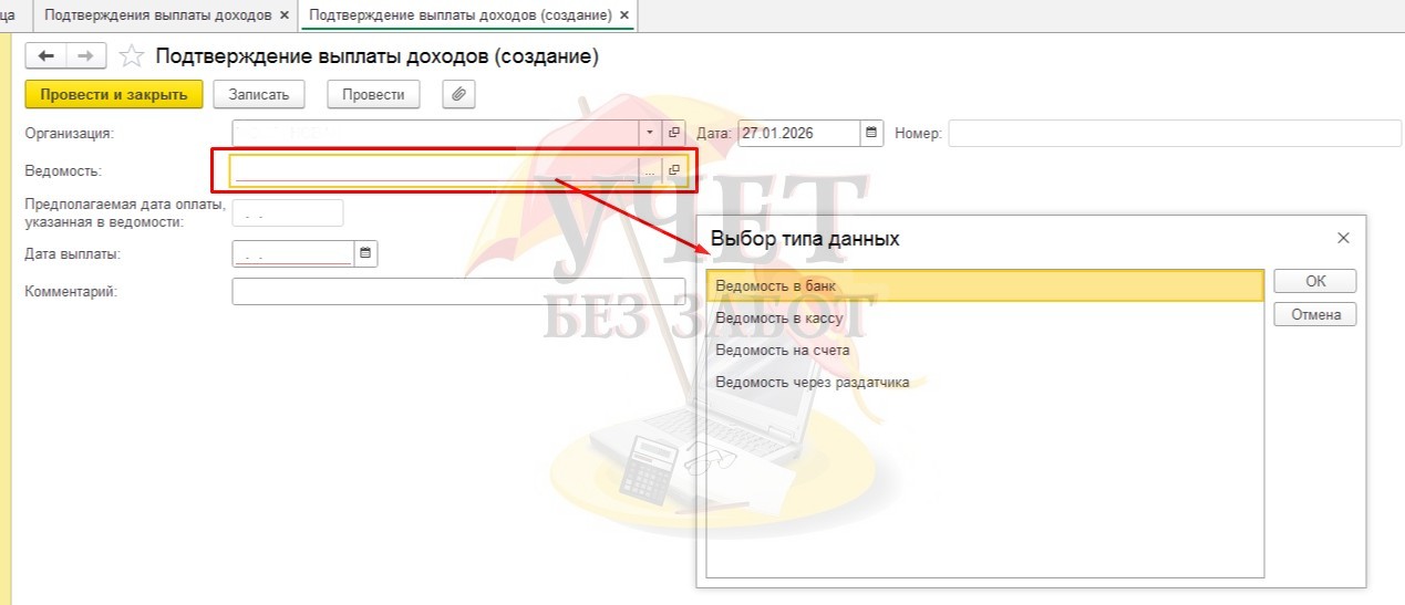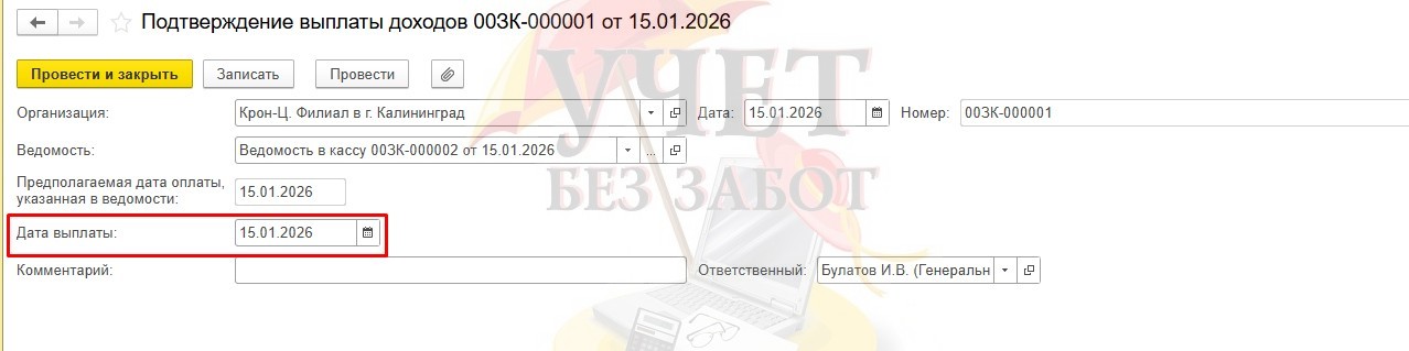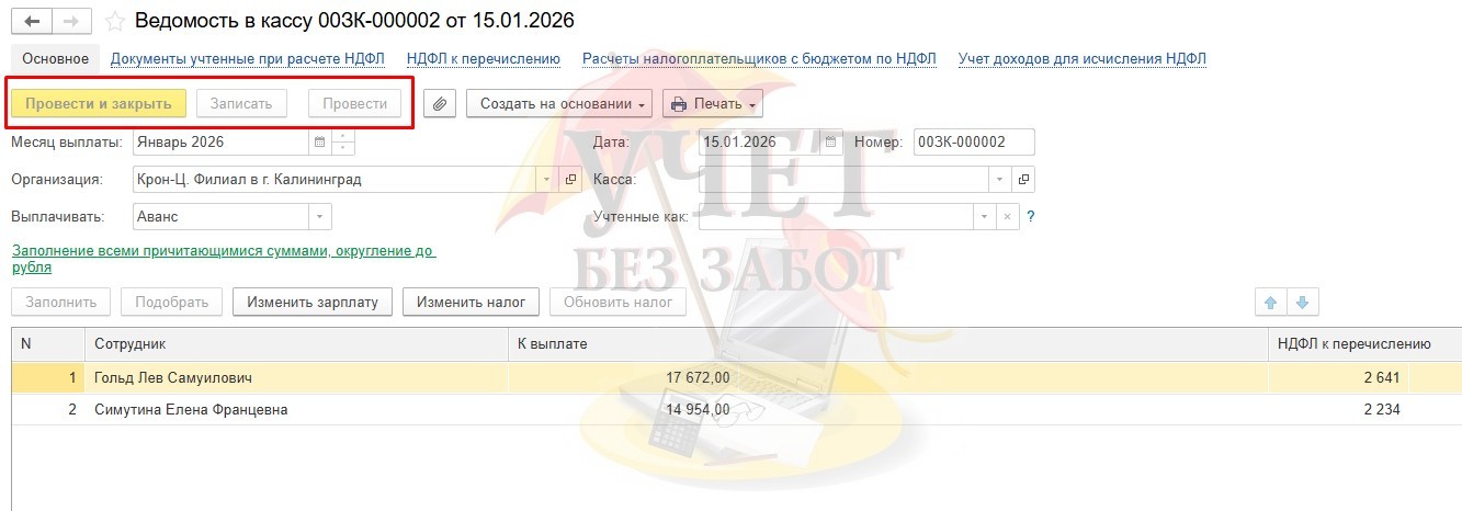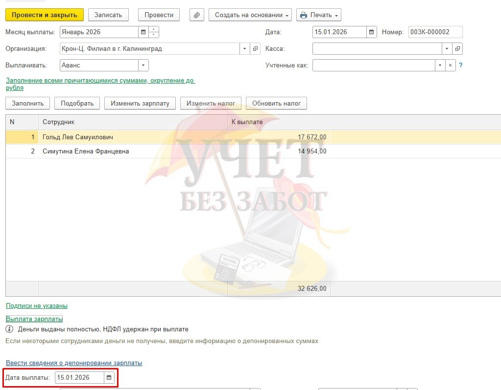 Рассмотрим на практическом примере: есть ведомость на выплату аванса от 15.01.2026 г.
