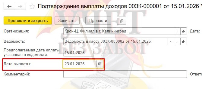 Предположим, что аванс на самом деле выплатили 23.01.2026, тогда в документе «Подтверждение выплаты доходов» изменим дату выплаты на 23.01.2026.