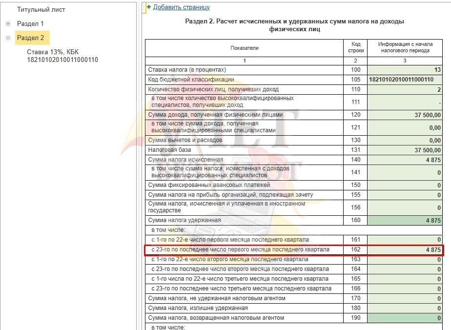 Тогда в отчете «6-НДФЛ» в Разделе 2 эта сумма будет отражаться по строке 162 – «с 23-ое по последнее число первого месяца последнего квартала».