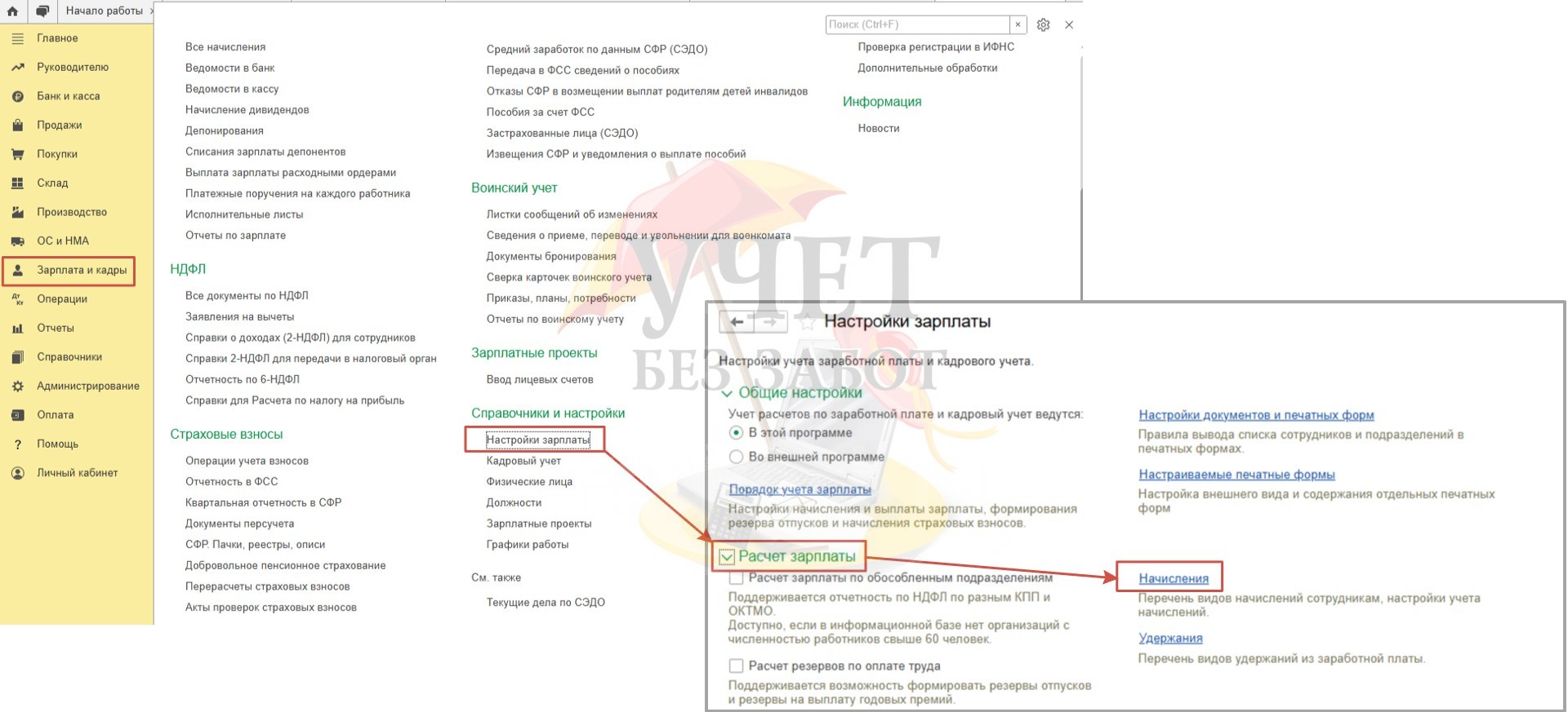 Перейдем в раздел меню «Зарплата и кадры» и выберем пункт «Настройки зарплаты». В подразделе «Расчет зарплаты» перейдем по ссылке «Начисления».