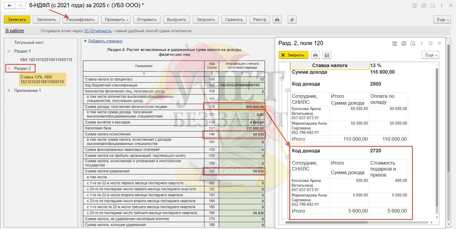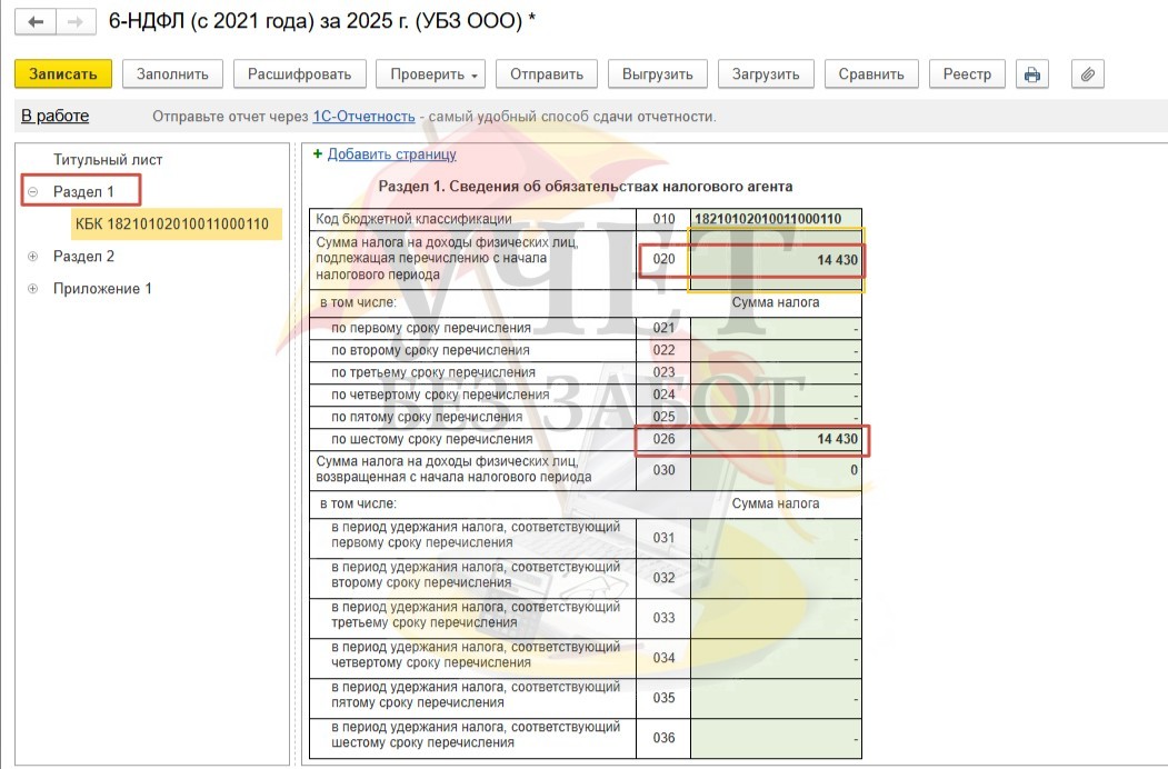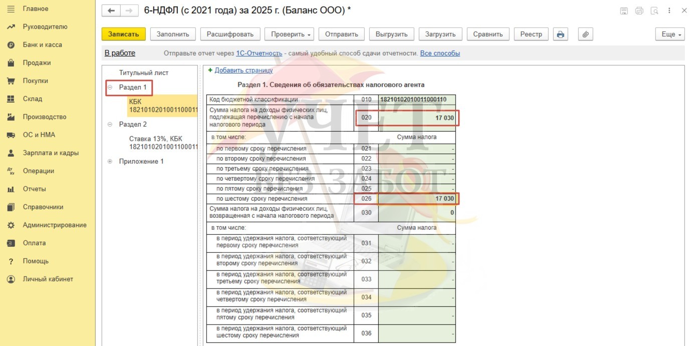 Сформируем отчет 6-НДФЛ за 2025г. в разделе меню «Отчетность-справки» - «1С-Отчтеность». Налог, исчисленный со стоимости подарка, превышающей 4 000 руб., отражается в составе суммы по строке 020 и 026 Раздела 1.