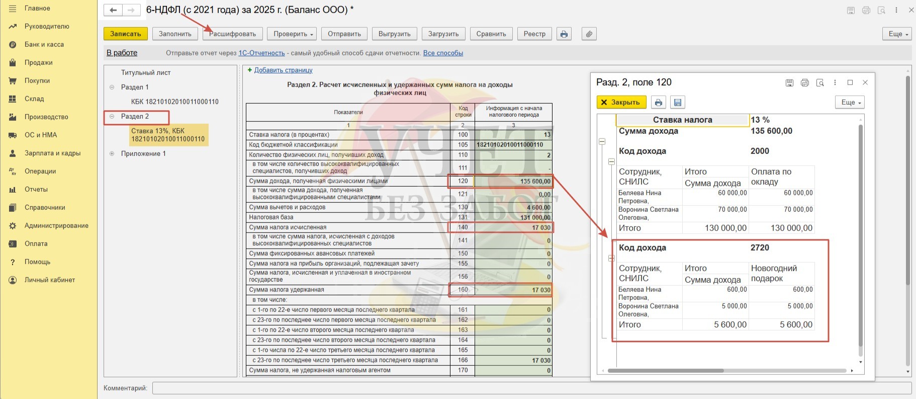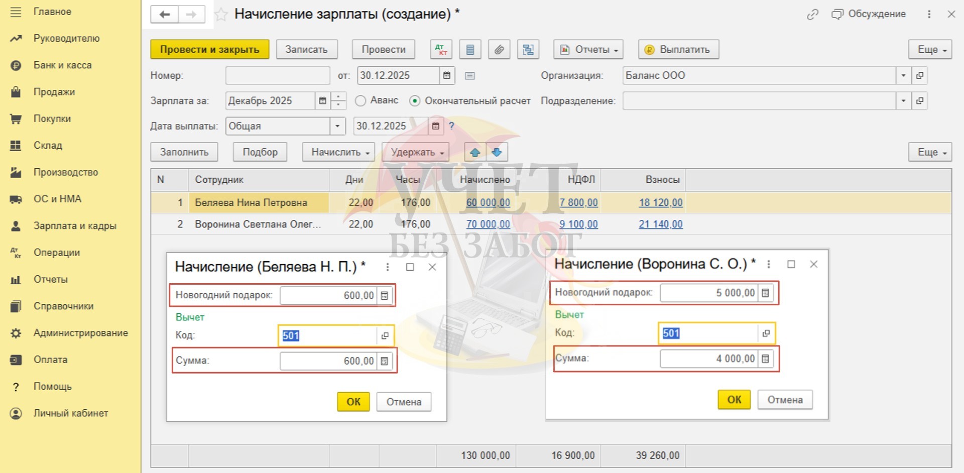После этого программа произведет расчет НДФЛ только с суммы основного начисления у сотрудницы Беляевой Н.П., а у сотрудницы Ворониной С.О. – не только с суммы основного начисления, но и с части стоимости подарка, превышающей вычет, то есть с суммы в размере 1 000 руб.