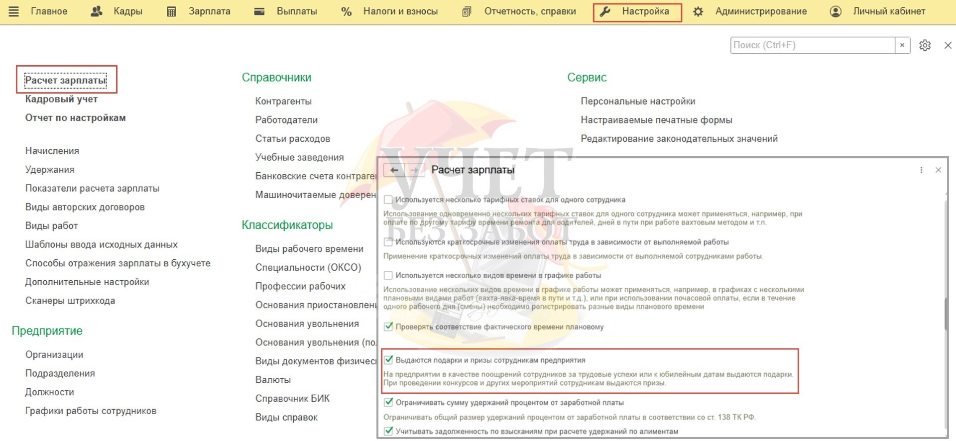 Перейдем в раздел меню «Настройка» - «Расчет зарплаты» и установим флаг «Выдаются подарки и призы сотрудникам предприятия».