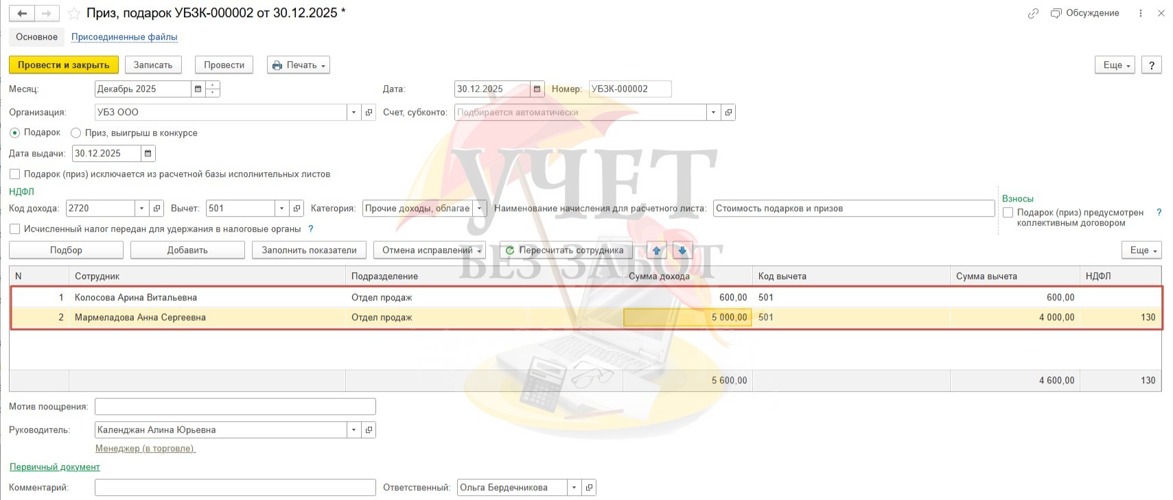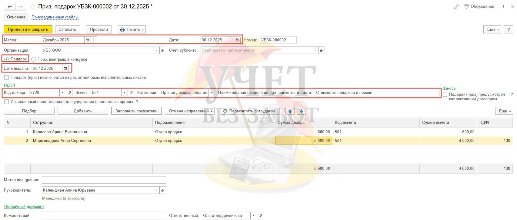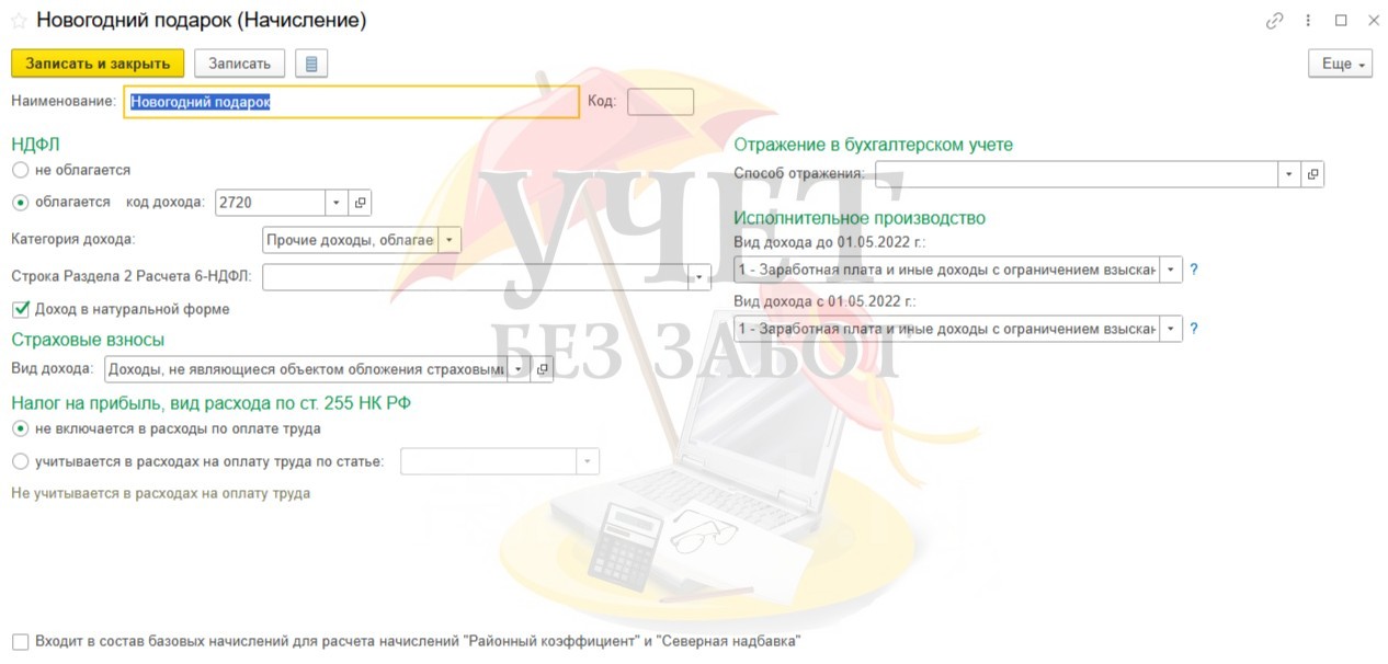 В целях корректной работы программы в части расчета НДФЛ нужно обязательно регистрировать все подарки сотрудникам в 1С, независимо от того, превысила ли стоимость подарка лимит в размере 4 000 руб. или нет.
