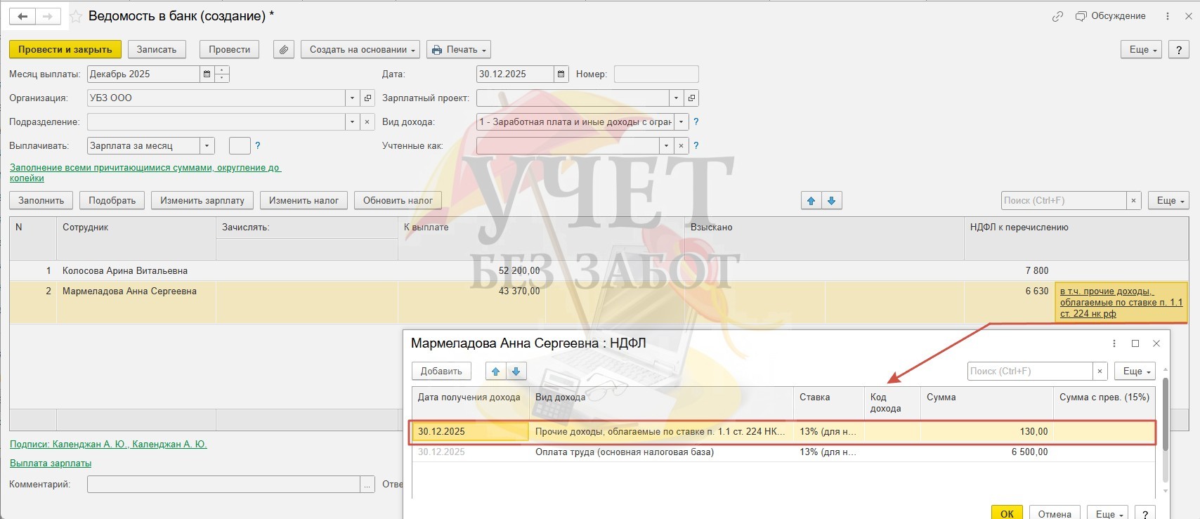 Зарегистрируем в разделе меню «Выплаты» - «Все ведомости на выплату зарплаты» новый документ «Ведомость в банк». Исчисленный НДФЛ со стоимости подарка Мармеладовой А.С. в части, превышающей установленный лимит, удерживается при ближайшей выплате денежного дохода.