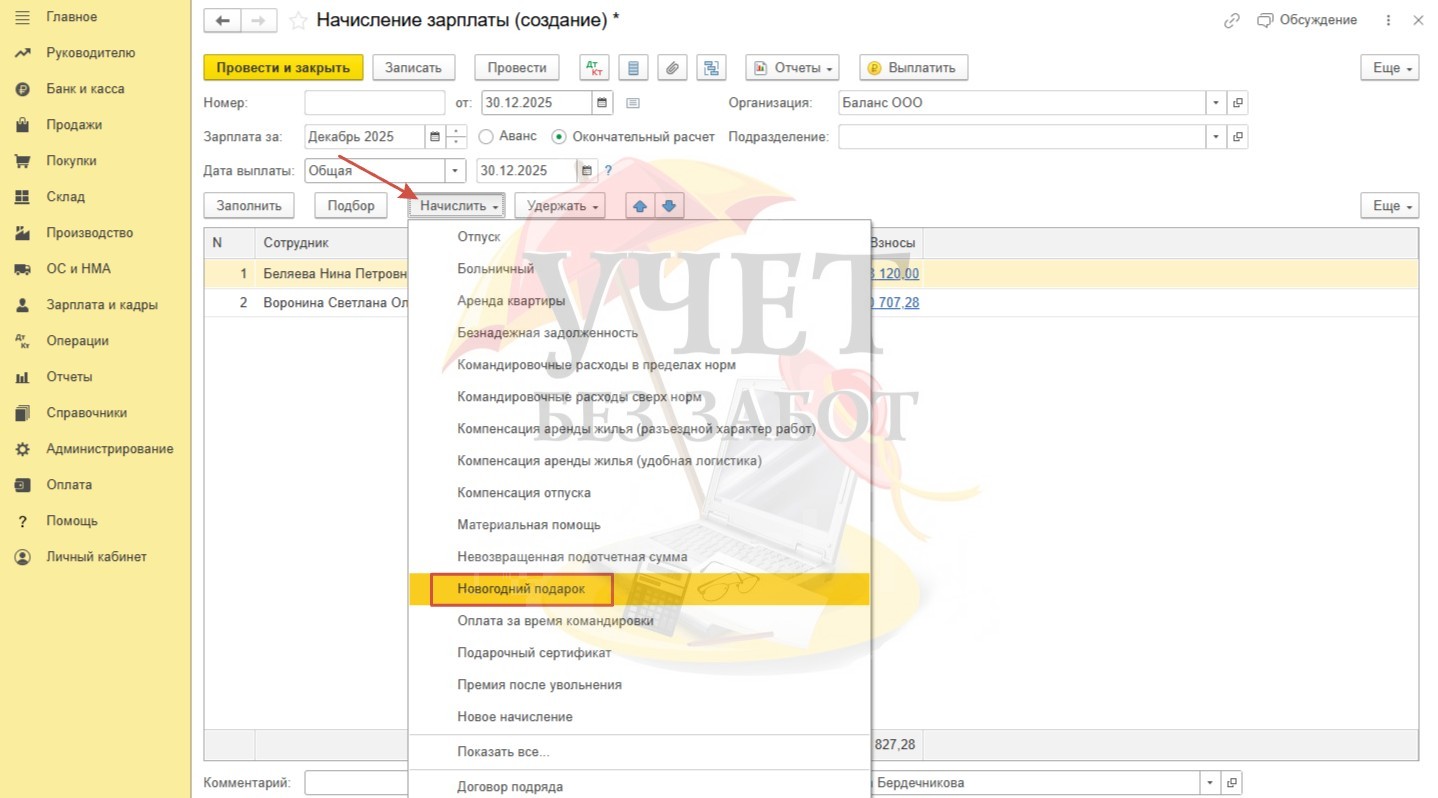 Начисление дохода в сумме стоимости подарка в программе 1С: Зарплата и управление персоналом 8 редакция 3.1 и 1С: Бухгалтерия 8 редакция 3.0