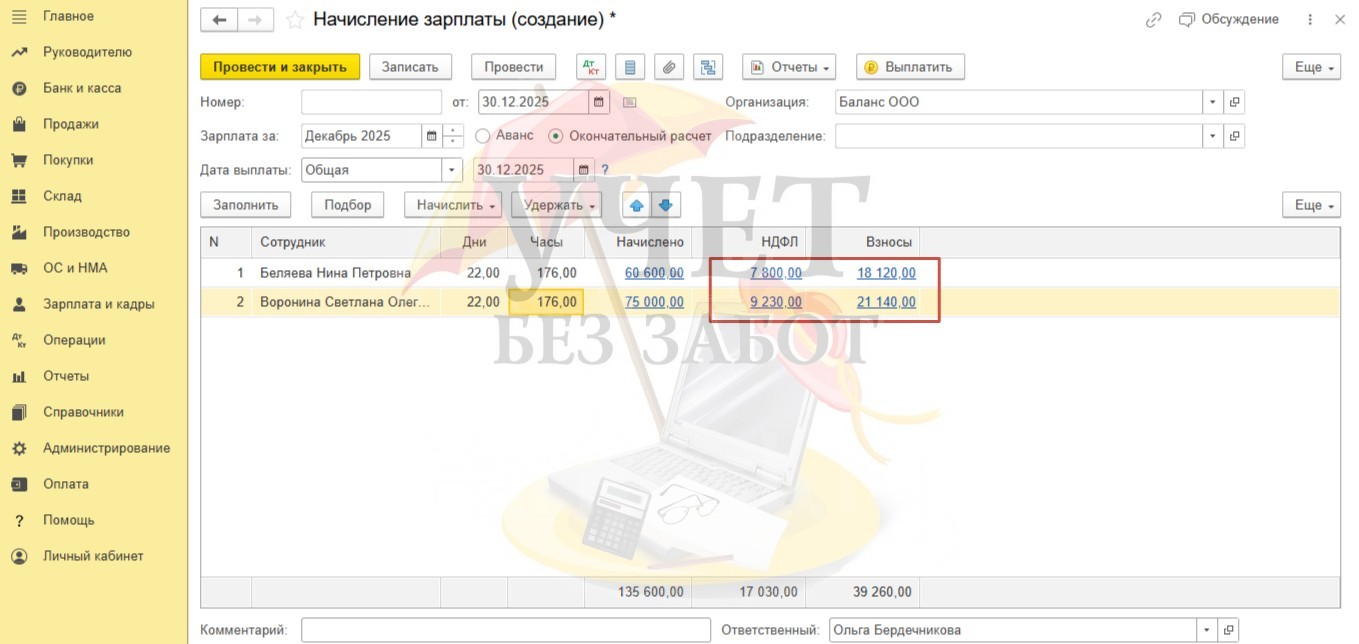 Страховые взносы по единому тарифу и взносы от НС и ПЗ начислены только на сумму основных начислений.