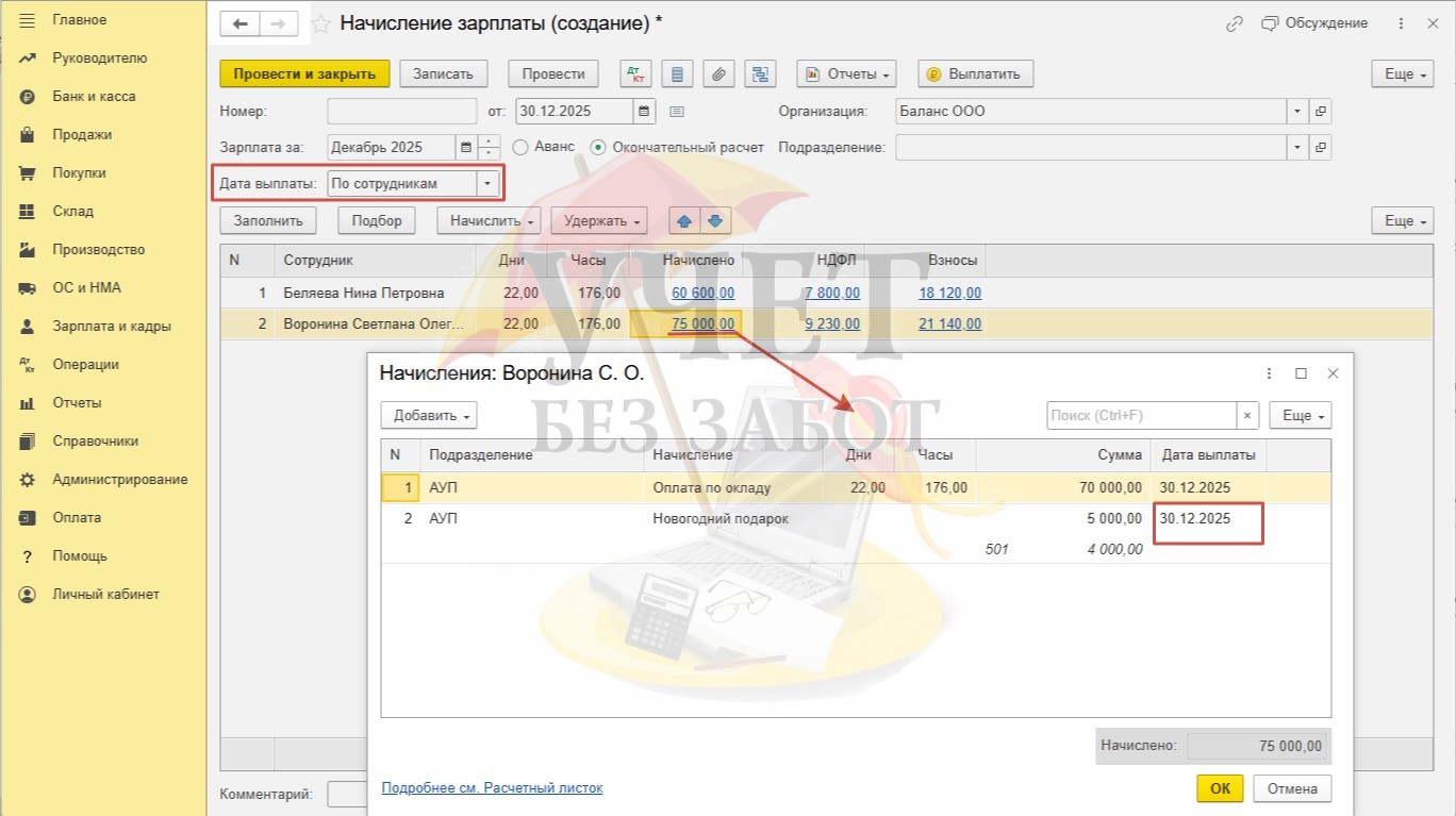 Если же для вручения подарков запланирована другая дата, то в поле «Дата выплаты» следует выбрать значение «По сотрудникам», перейти по ссылке-сумме в колонке «Начислено» и указать нужную дату для «подарочного» начисления.