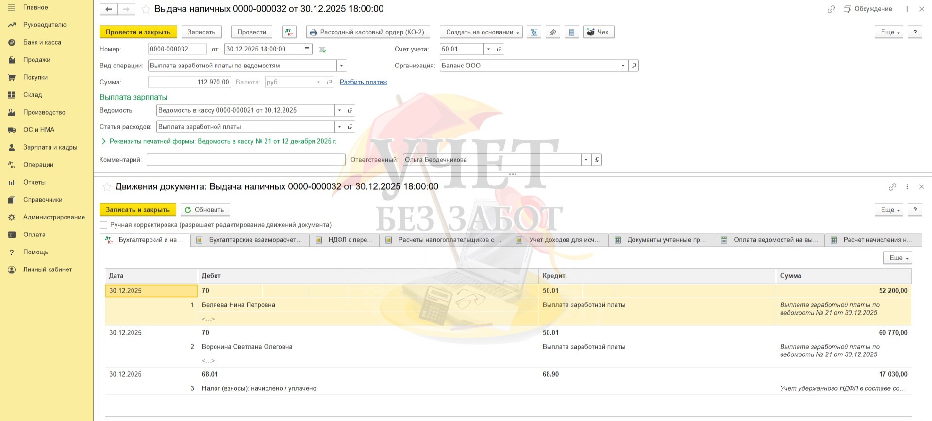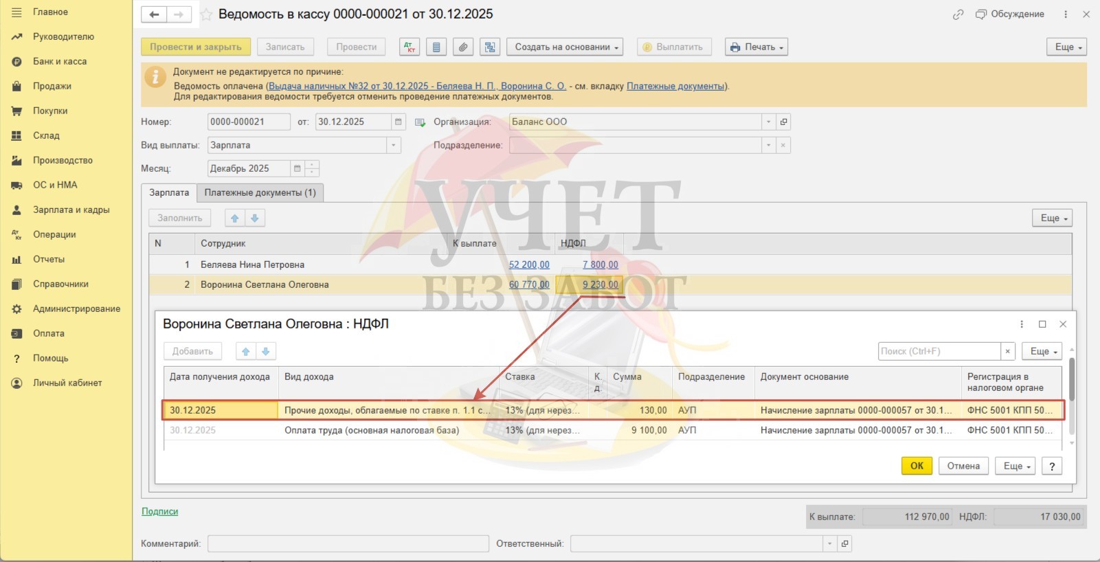 Перейдем в раздел меню «Зарплата и кадры» - «Ведомости в кассу». Зарегистрируем документ «Ведомость в кассу». При выплате денежного дохода сотрудницам удерживается НФДЛ, в том числе и со стоимости подарка Ворониной С.О.