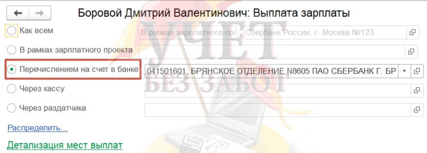 Если указано «В межрасчетный период», то по кнопке «Выплатить» в командной панели документа «Отпуск» можно сразу создать документ «Ведомость в кассу», «Ведомость в банк», «Ведомость на счета», «Ведомость через раздатчика». Вид документа на выплату будет формироваться в соответствии с настройками организации, либо подразделения, либо по сотруднику (в нашем примере согласно настройкам по сотруднику).