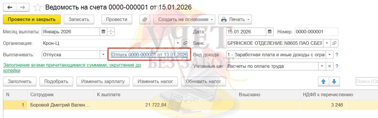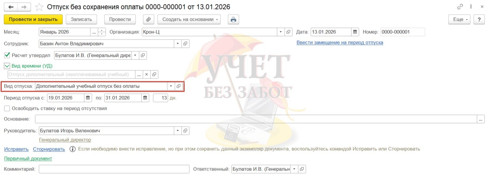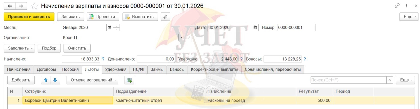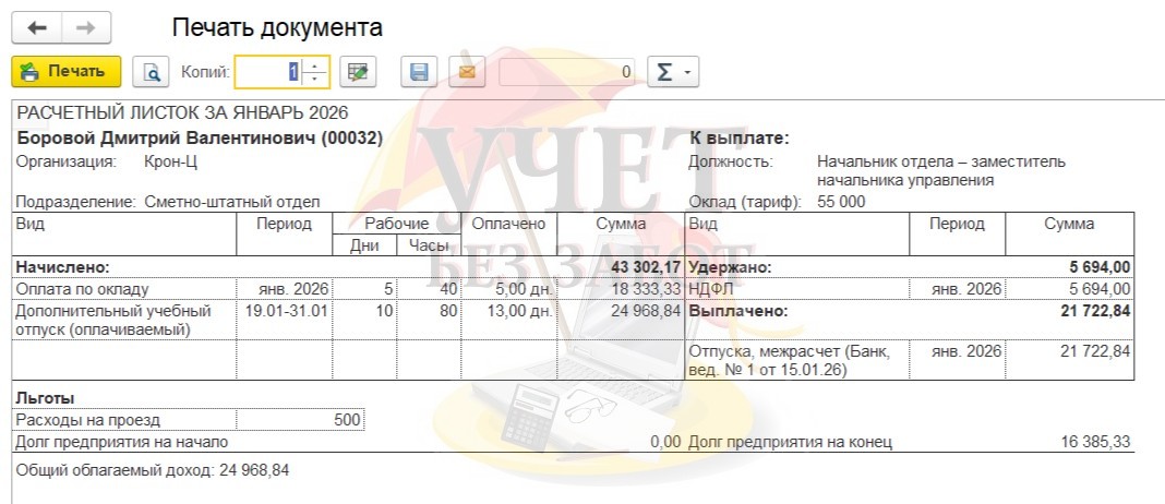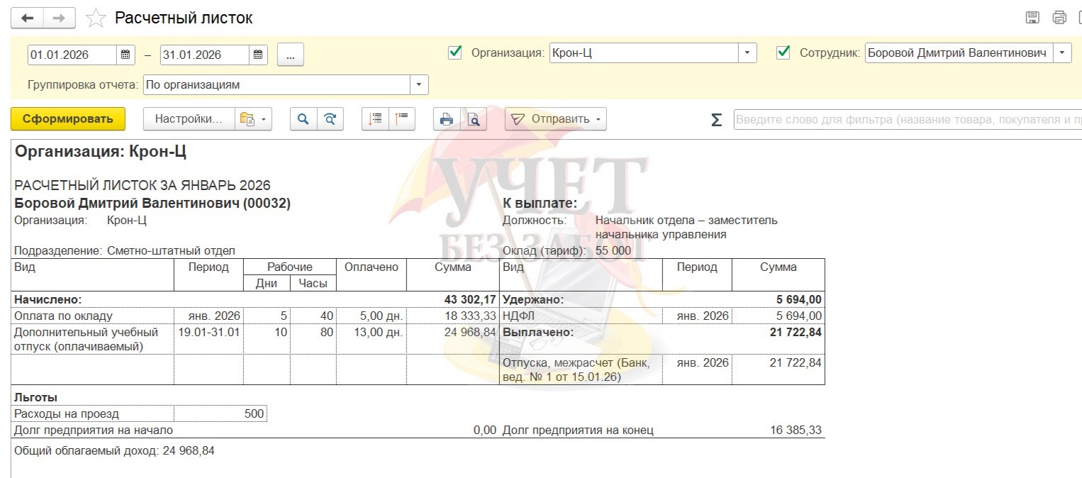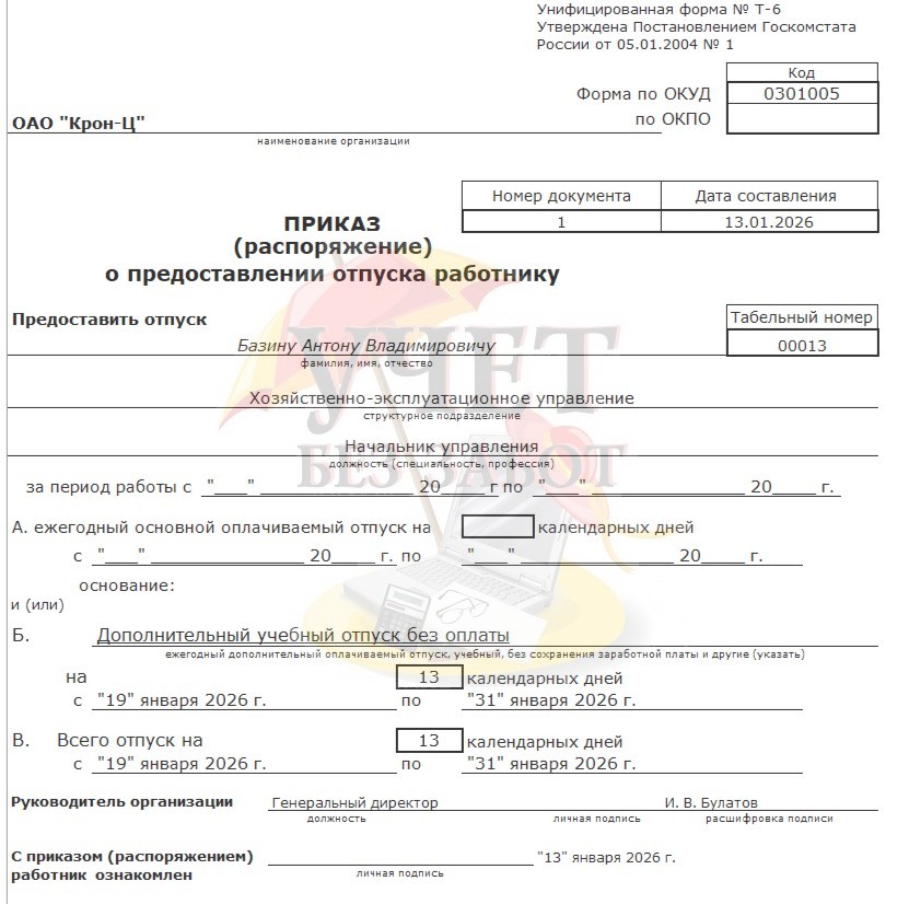 Практический пример: В ОАО «Крон-ц» работает сотрудник Базин А.В. в должности начальника управления с окладом в 65 000 руб. в месяц. Также сотруднику ежемесячно компенсируются расходы на проезд в фиксированной сумме 500 руб. Данное начисление облагается НДФЛ и страховыми взносами, не включается в базу начислений при расчете среднего заработка. 12.01.2026 г. Базин А.В. принес в бухгалтерию организации справку-вызов из образовательного учреждения и заявление на предоставление дополнительного отпуска без оплаты (учебный отпуск), т.к. получает второе профессиональное образование. На основании справки-вызова бухгалтер оформляет сотруднику Боровому Д.В. неоплачиваемый учебный отпуск.