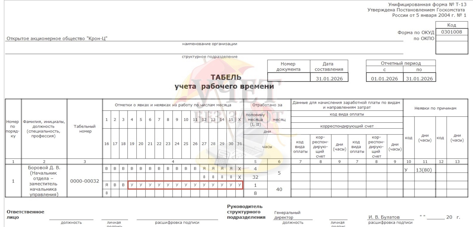 Сформировать табель учета рабочего времени можно в разделе меню «Зарплата» - «Отчеты по зарплате» - «Табель учета рабочего времени (Т-13)».