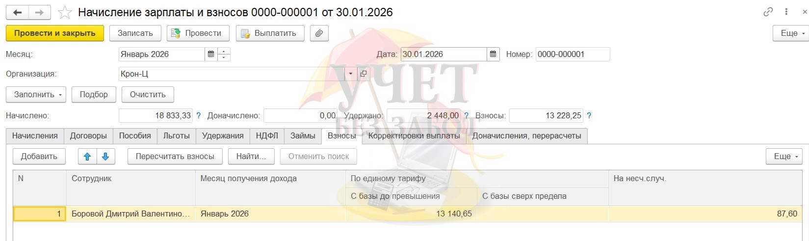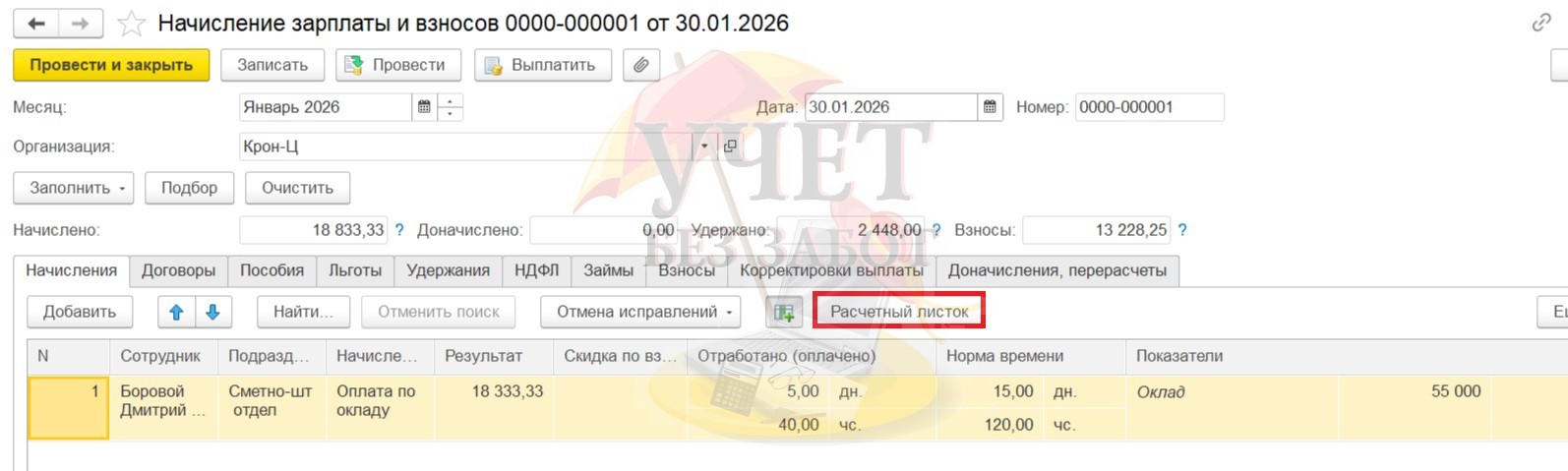 Проведем окончательный расчет - начисление заработной платы и взносов за январь. Начислена заработная плата в сумме 18 333,33 руб., взносы - 13 228,25 руб., НДФЛ - 2 448 руб.