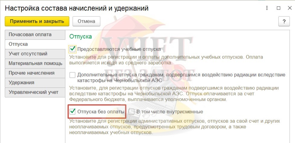 В разделе меню «Настройки» - «Расчет зарплаты» - «Настройка состава начислений и удержаний» необходимо включить флажок «Отпуска без оплаты», далее нажать кнопку «Применить и закрыть».