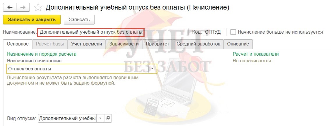 При включенном флажке в справочнике «Начисления» (раздел меню «Настройка» - «Начисления») будет автоматически добавлен вид начисления «Дополнительный учебный отпуск без оплаты».