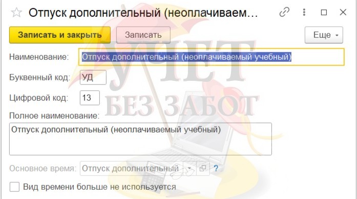 В справочнике «Виды использования рабочего времени» отпуск дополнительный (неоплачиваемый учебный) имеет буквенный код «УД».