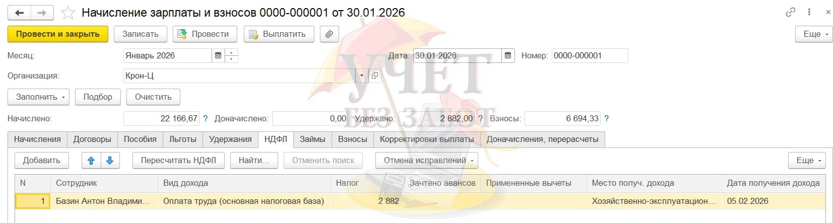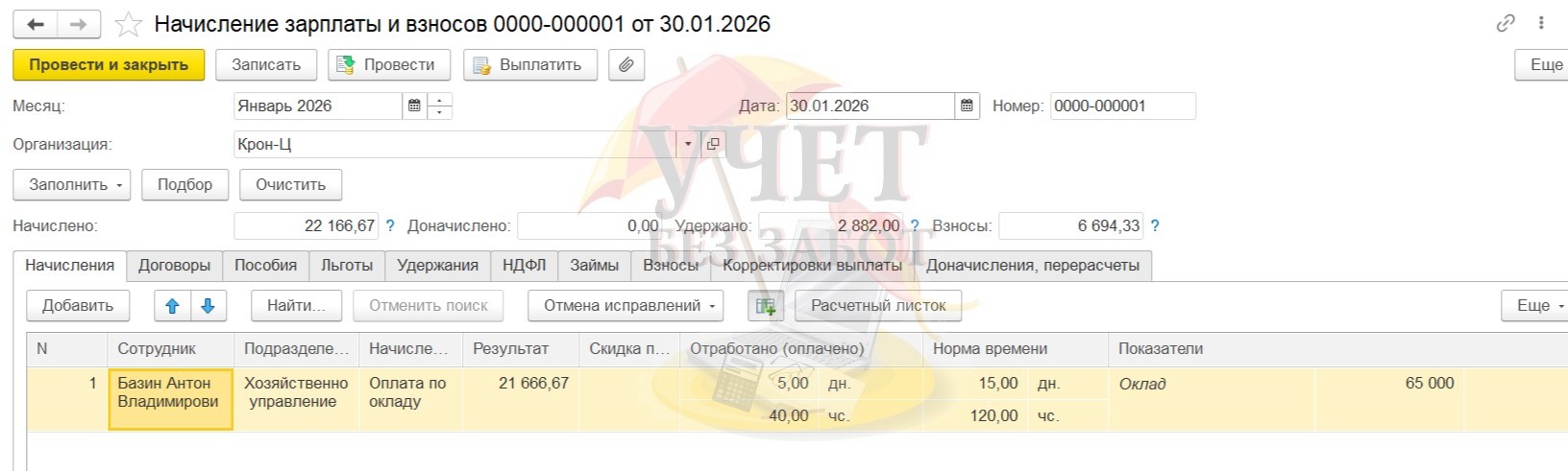 Проведем окончательный расчет - начисление заработной платы и взносов за январь. Начислена заработная плата в сумме 21 666,67 руб., взносы - 6 694,33 руб., НДФЛ - 2 882 руб.