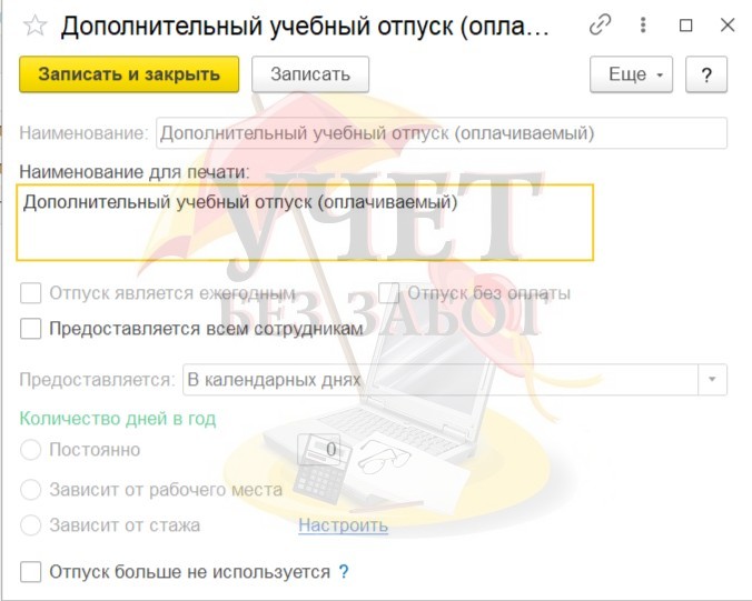 Для оформления неоплачиваемого учебного отпуска необходимо провести следующие настройки в программе.