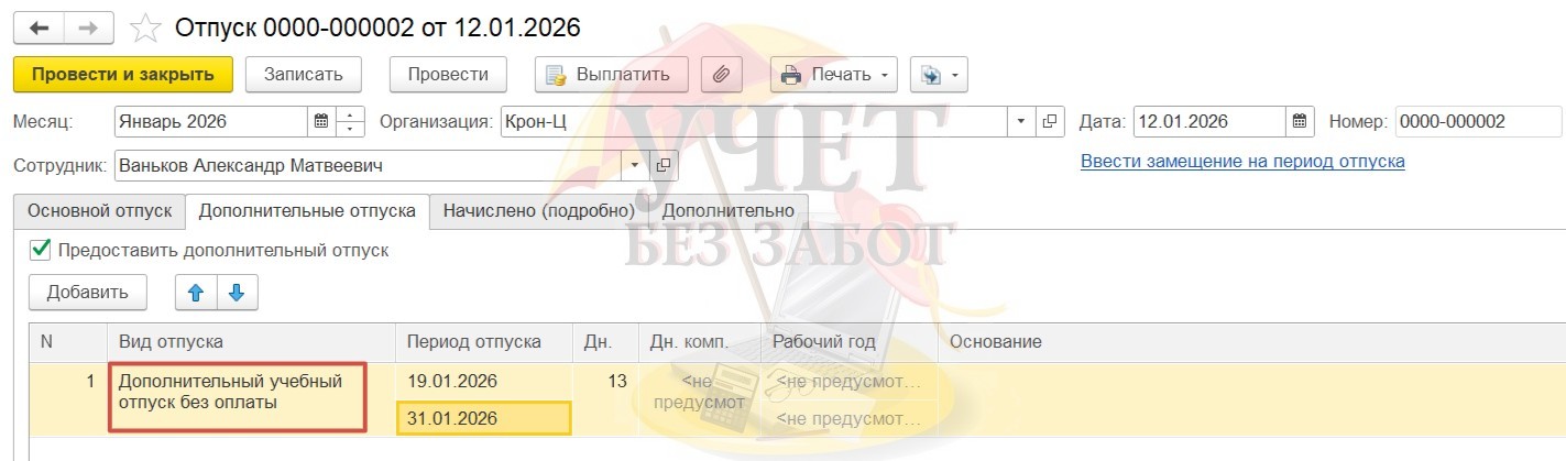 На вкладке «Дополнительные отпуска» необходимо выбрать из справочника «Виды отпусков» дополнительный учебный отпуск без оплаты, заполнить период отпуска, документ провести.