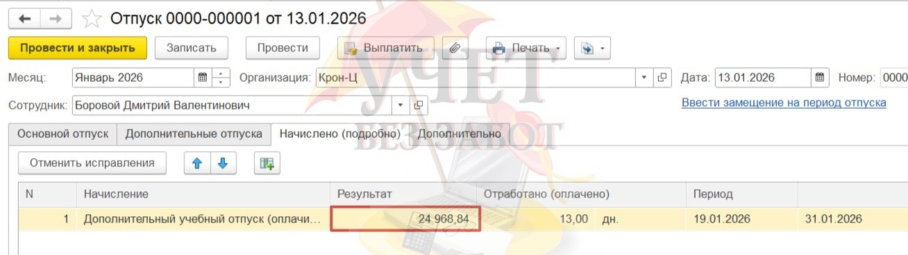 На вкладке «Начислено (подробно)» будет отражен расчет отпуска по виду начисления «Дополнительный учебный отпуск (оплачиваемый)».
