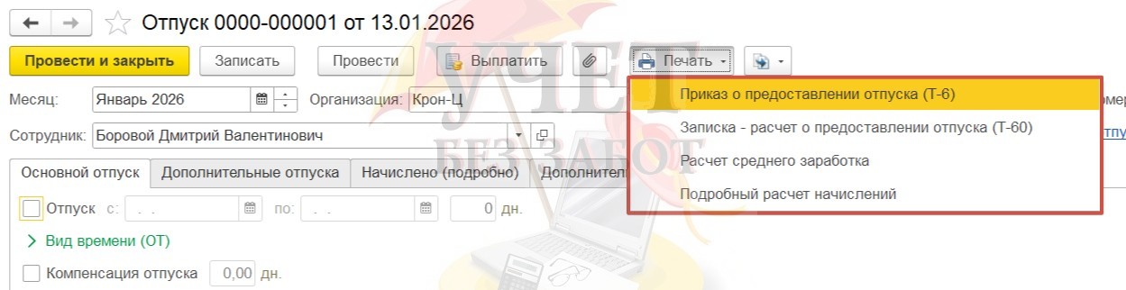 Из документа «Отпуск» по кнопке «Печать» можно сформировать унифицированную печатную форму Т-6 «Приказ (распоряжение) о предоставлении отпуска работнику».