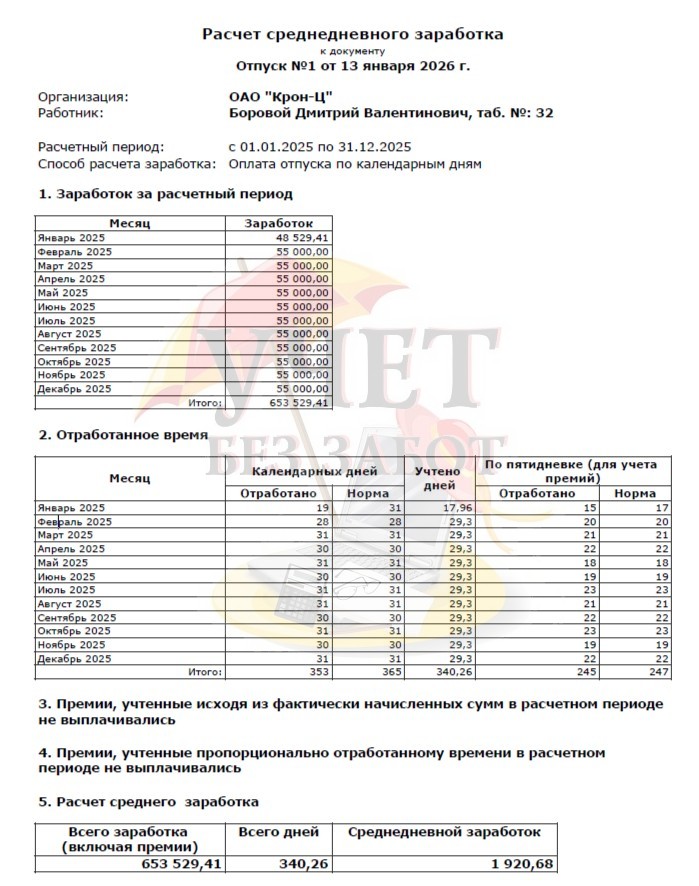 Среднедневной заработок для расчета отпускных составляет: 653 529,41 руб. / 340,26 дней = 1920,68 руб. Отпускные за период с 19.01.2026 по 31.01.2026 составляют: 1920,68 руб. * 13 дней = 24 968,84 руб.