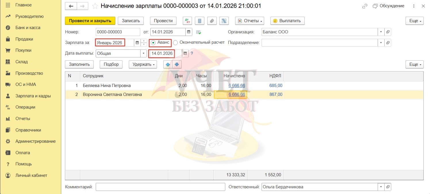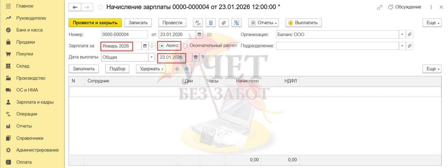 В поле «Зарплата за» выберем значение «Январь 2026», а после этого переведем переключатель в положение «Аванс». Обратите внимание, что для корректной работы программы в части НДФЛ в поле «Дата выплаты» должна быть установлена фактическая дата выдачи денежных средств.