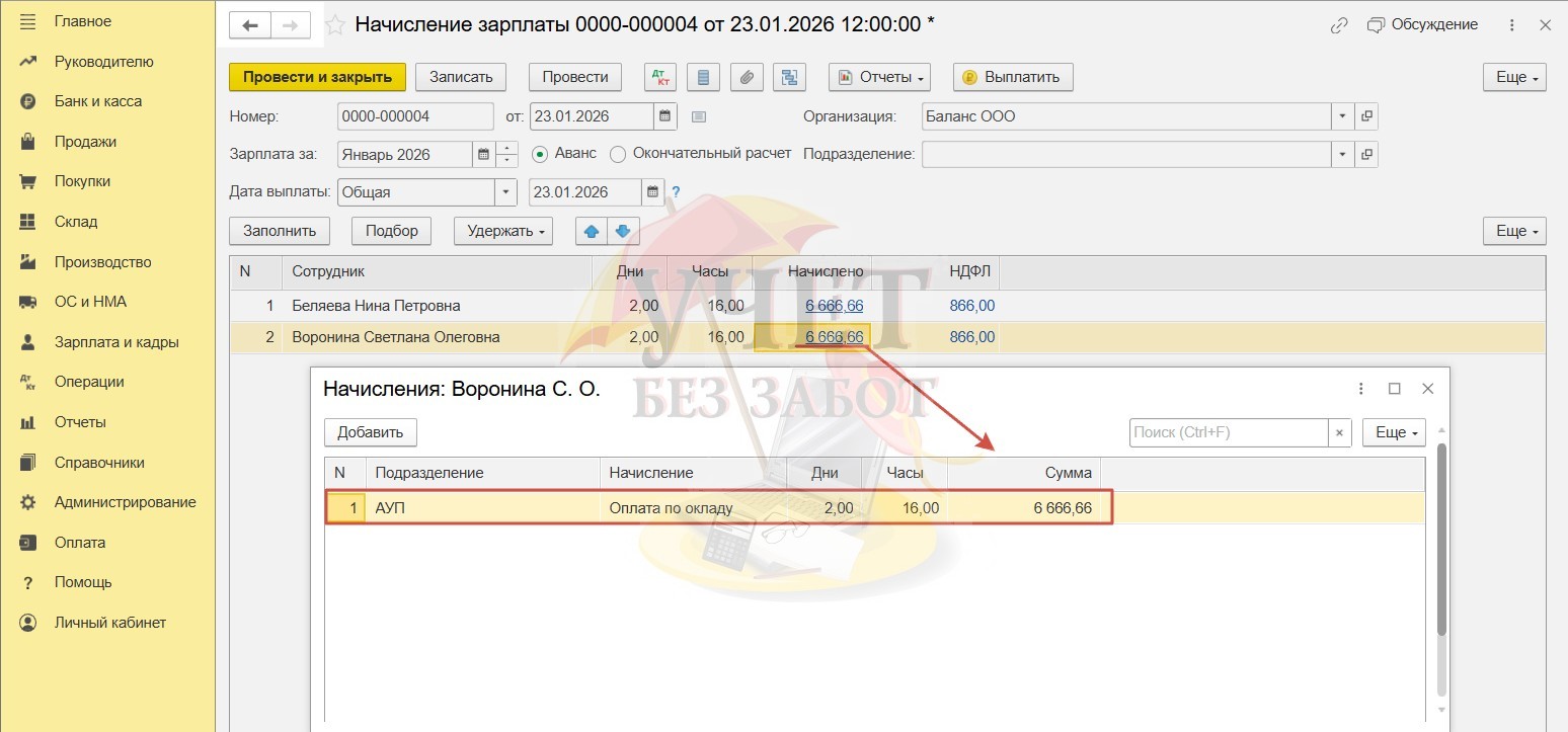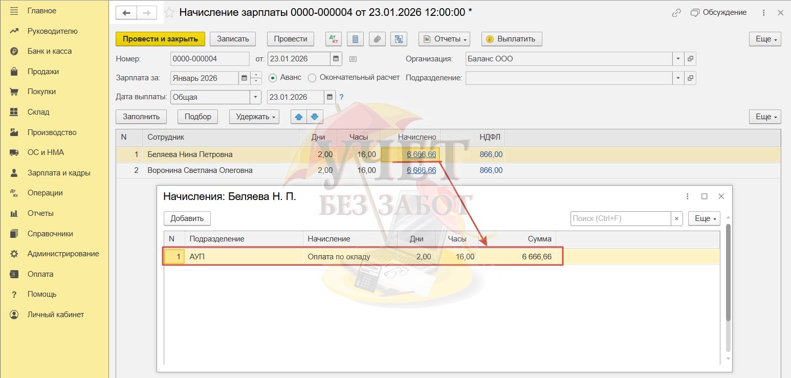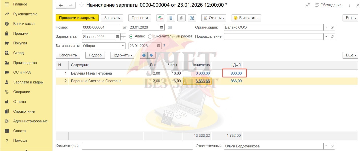 Обращаем ваше внимание, что в предлагаемой инструкции мы будем использовать способ начисления двух документов «Начисление зарплаты» с видом «Аванс». Отметим, что ранее разработчики не рекомендовали использовать такой метод из-за некорректной работы программы в части НДФЛ. На текущий момент при реализации практического примера, программа сформировала все операции верно. Если вы столкнетесь с каким-либо некорректным поведением программы при использовании предлагаемого нами способа, можно сообщить нам об этом в комментариях, чтобы мы смогли отредактировать публикацию.