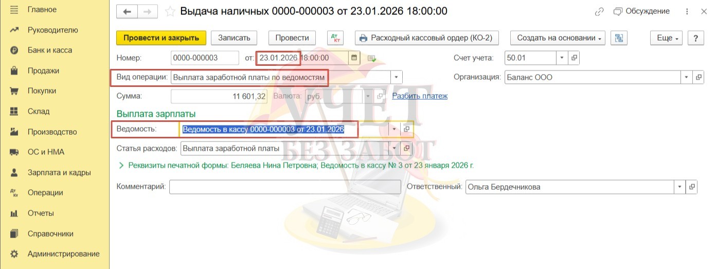 А теперь в разделе меню «Банк и касса» - «Кассовые документы» зарегистрируем документ «Выдача наличных» с видом операции «Выплата заработной платы по ведомостям».