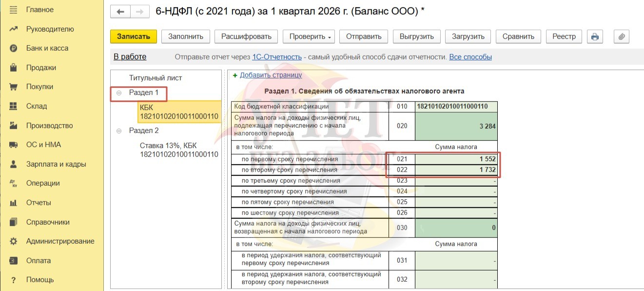 Перейдем в раздел меню «Отчеты» - «Регламентированные отчеты» и сформируем 6-НДФЛ за 1 квартал 2026г, чтобы убедиться, что операции оформлены корректно.