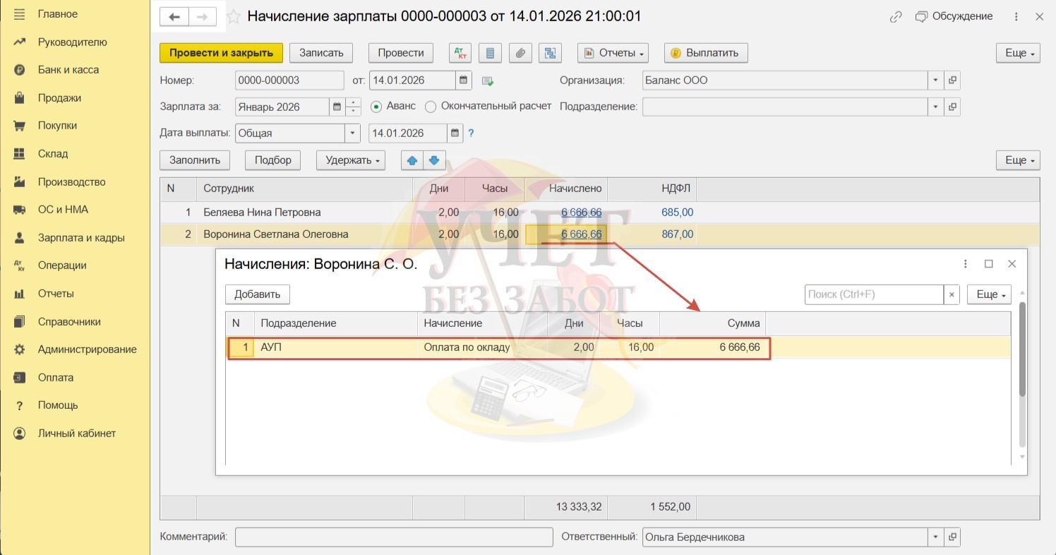 Отработанное время и оклад у сотрудниц совпадают. Поэтому заполнение формы «Начисление» у Ворониной С.О. будет аналогичным.