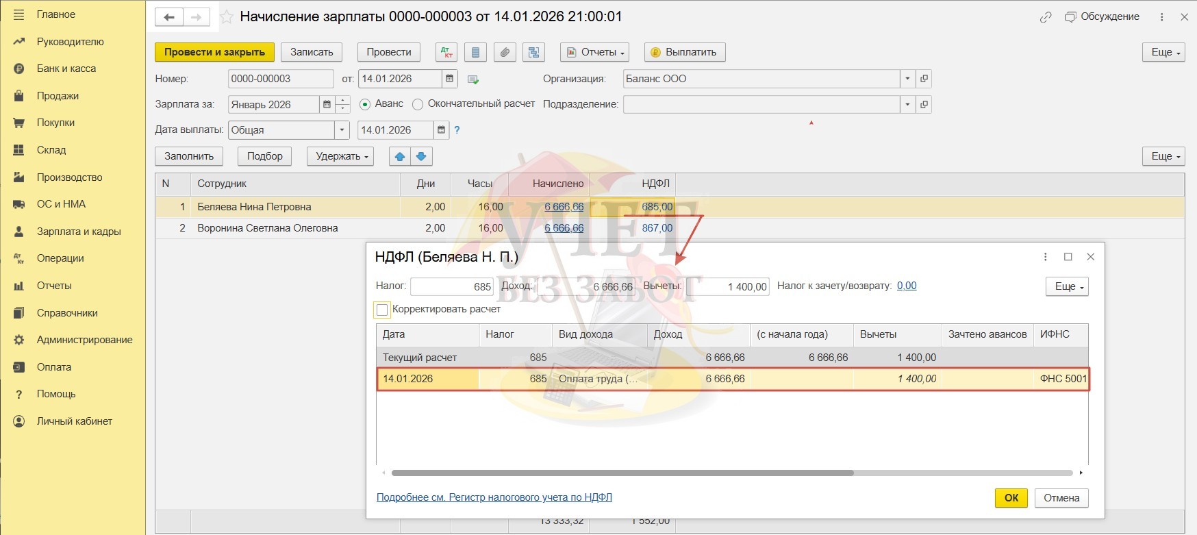 Обратите внимание, поскольку вычет у Беляевой Н.П. уже был применен при выплате первого аванса 14.01, теперь НДФЛ исчислен с полной суммы.