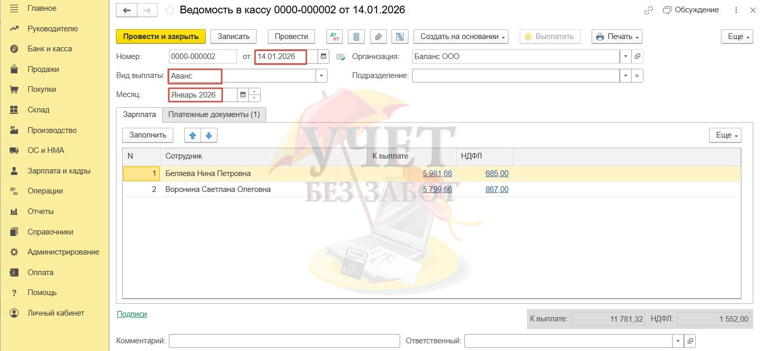 Оформим выплату первого аванса. Для этого зарегистрируем документ «Ведомость в кассу» в разделе меню «Зарплата и кадры» - «Ведомости в кассу». Дата документа – 14.01.