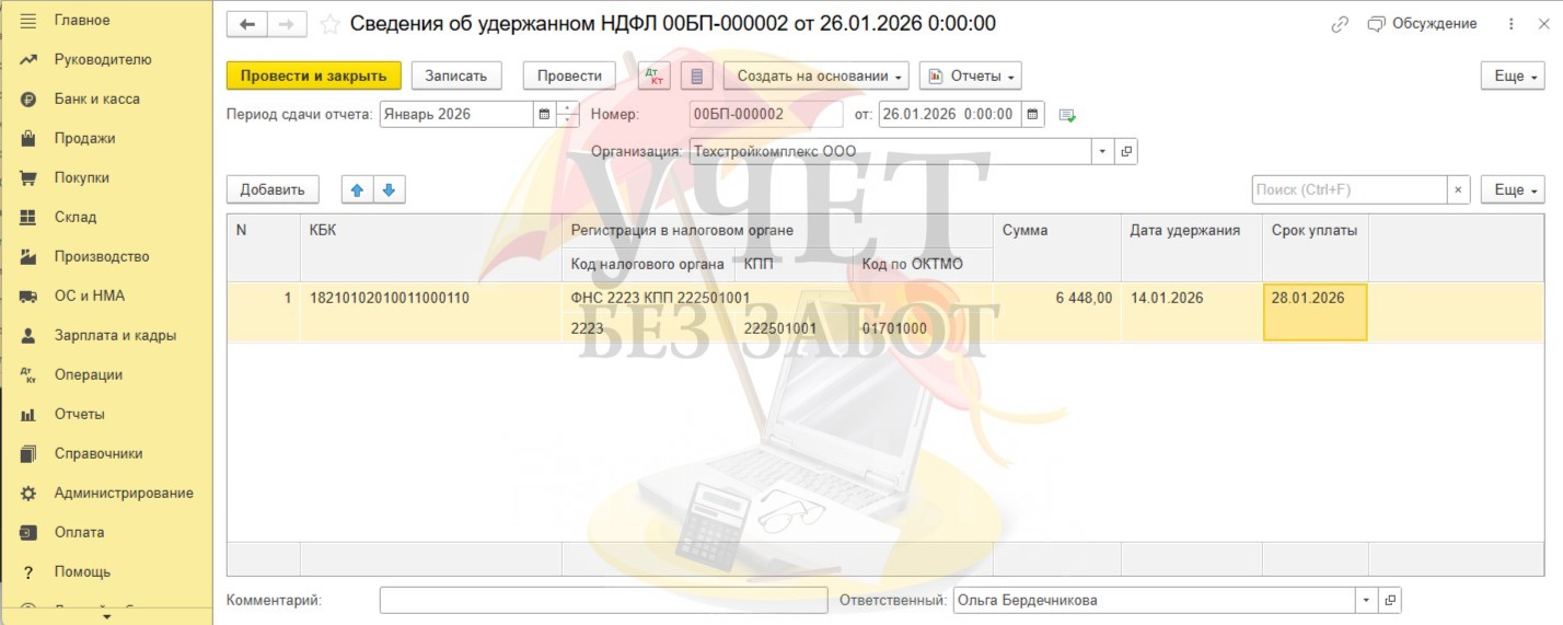 Вновь создадим документ «Отражение удержанного НДФЛ в бухучете» в разделе меню «Зарплата». В поле «Период сдачи отчетов» выбираем «Январь 2026». Напоминаем, что уведомление по удержанному налогу мы должны представить по сроку 26.01.2026г.