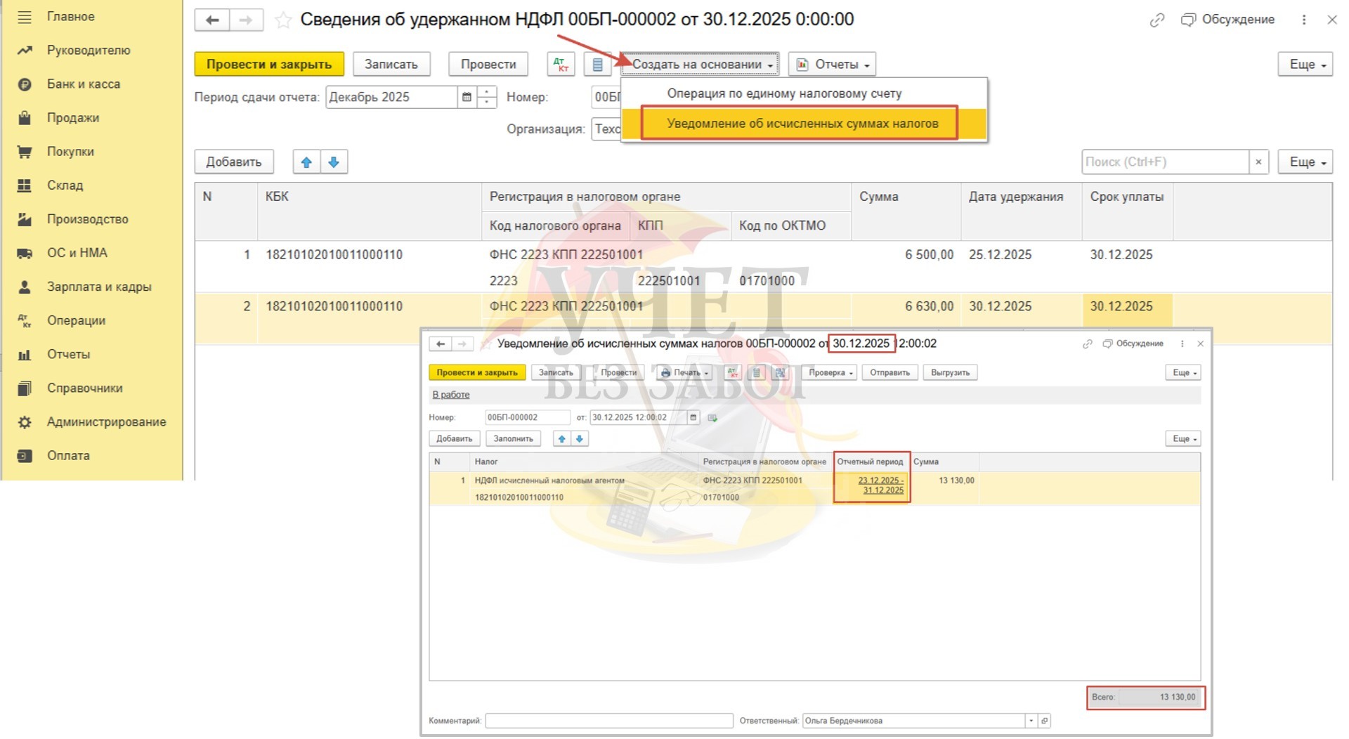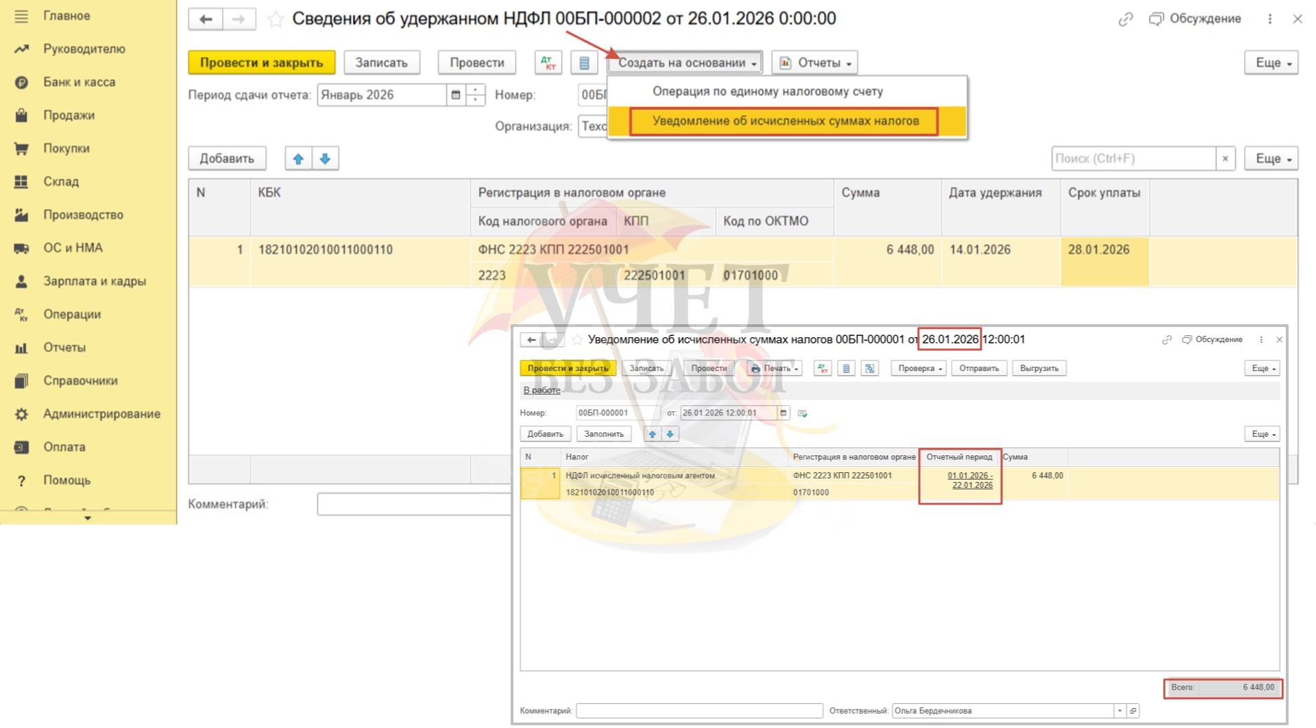 Уведомление об исчисленных суммах налога удобно создать на основании документа «Сведения об удержанном НДФЛ». Дата отправки уведомления – 26.01.2026.