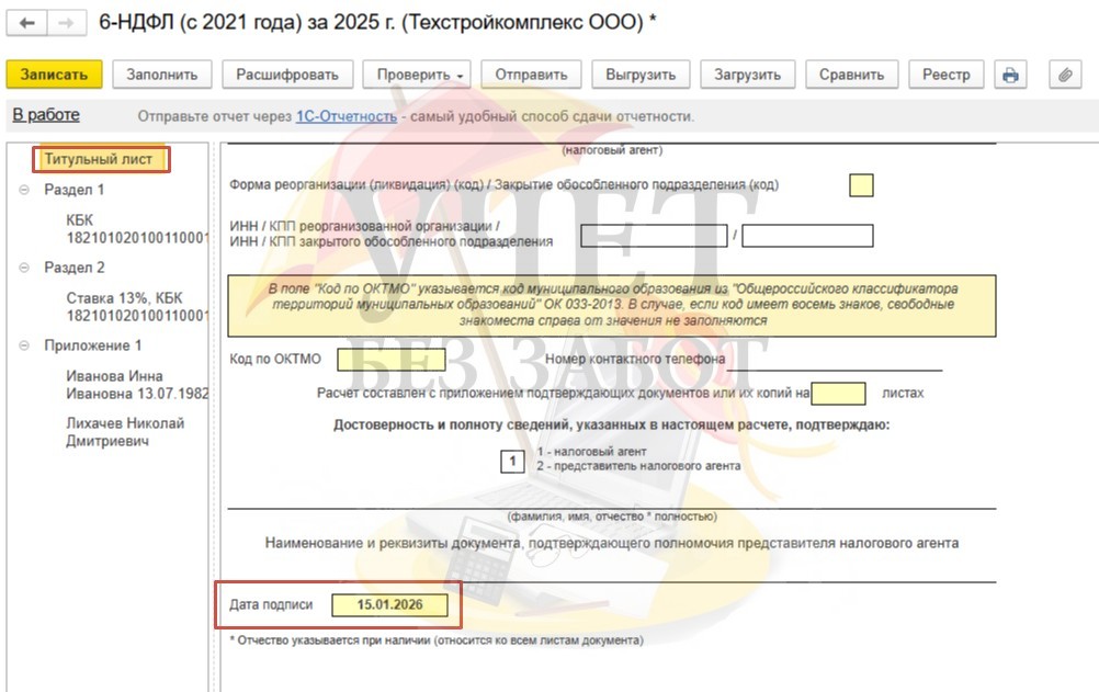 Важно! Для корректного заполнения отчета за 2025 год дата подписи на титульном листе должна быть больше, чем дата удержания НДФЛ в январе (то есть дата выплаты). В противном случае есть вероятность неправильного заполнения строк в части удержанного/ не удержанного налога.