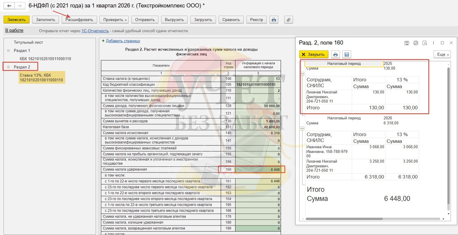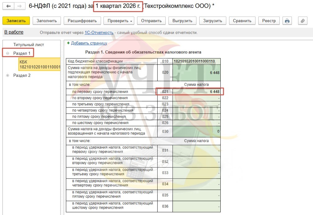 Налог, удержанный с окончательного расчета по декабрьской зарплате и с натурального дохода в виде стоимости подарка отражается по строке 021 Раздела 1 в отчете за 1 квартал 2026г.