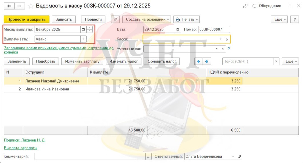 В разделе меню «Выплаты» - «Ведомости в кассу» создадим новый документ. В поле «Месяц выплаты» - «Декабрь 2025», «Выплачивать» - «Аванс», дата документа – 29.12.2025. После заполнения документа убедимся в корректности сумм. Данные верны. Проведем документ.