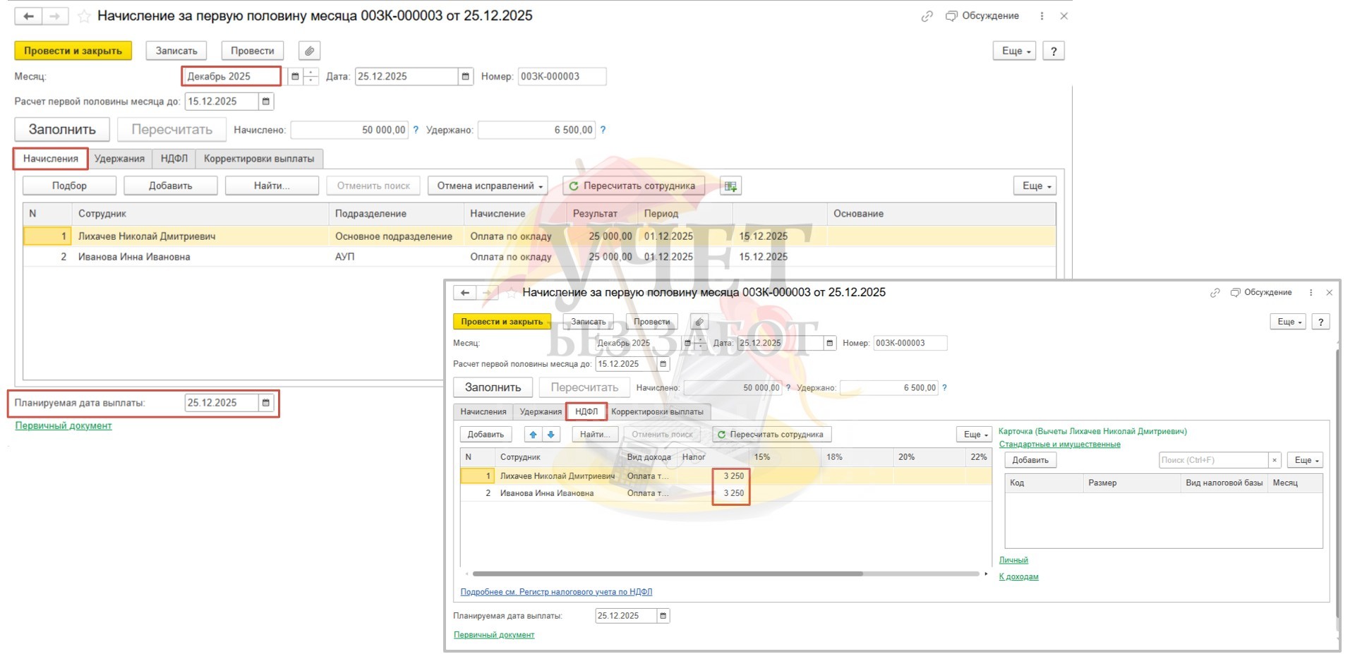 В поле «Месяц» выбираем значение «Декабрь 2025». Поле «Расчет первой половины месяца до..» заполнено автоматически – 15.12.2025 – оставим такую дату. На вкладке «Начисления» по кнопке «Заполнить» программа добавит начисления из расчета отработанных дней. Внизу формы документа есть поле «Планируемая дата выплаты». Очень важно, чтобы здесь была установлена фактическая дата выдачи зарплаты. В нашем случае это 29.12.25. На вкладке «НДФЛ» видим исчисленный налог. У сотрудника Лихачева Н.Д. налог рассчитан без особенностей. У сотрудницы Ивановой И.И. НДФЛ также исчислен с общей суммы начислений. Предполагается, что декабрьский вычет на ребенка был использован при выплате ноябрьской зарплаты в начале декабря.