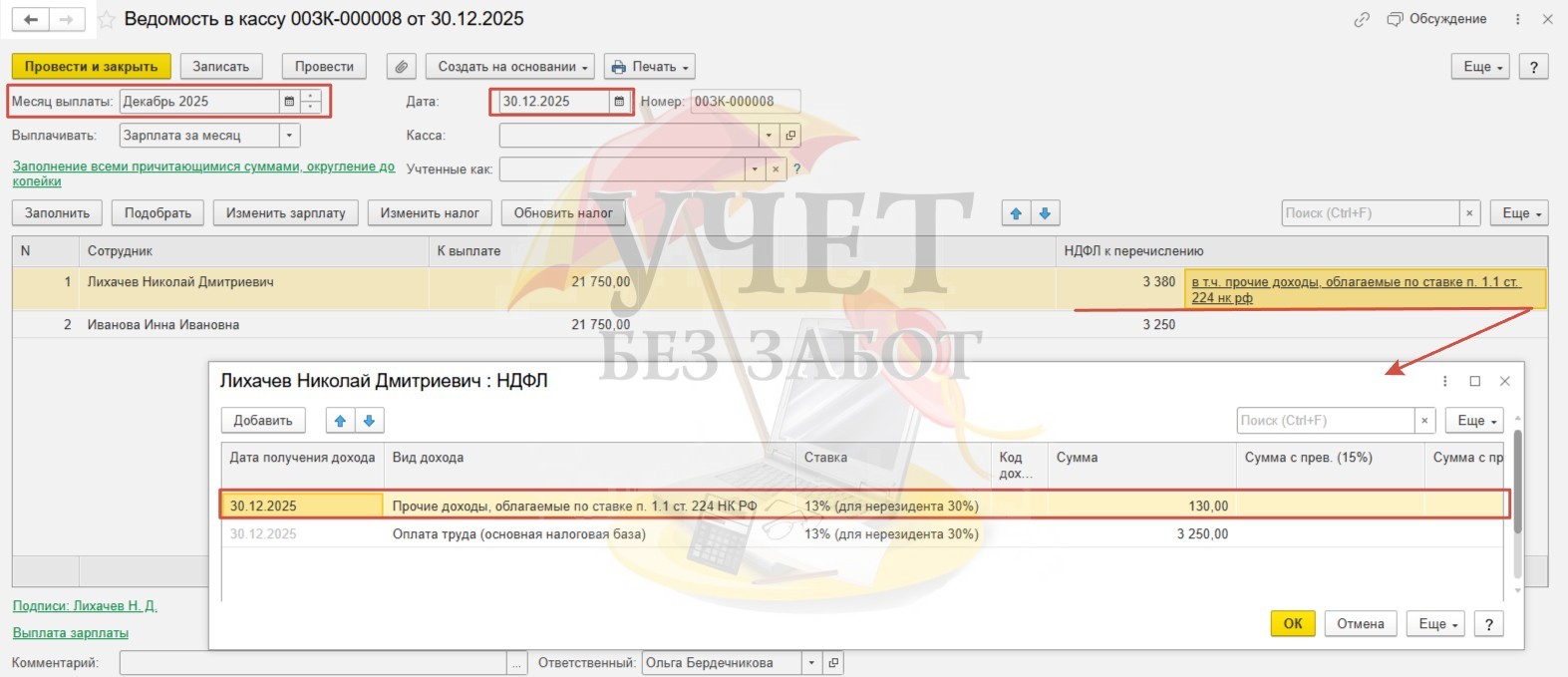 После этого создадим ведомость на выплату в разделе меню «Выплаты» - «Ведомости в кассу». Документ должен быть датирован 30.12.25г. - в соответствии с реальной датой выплаты. Обратите внимание, вместе с НДФЛ по окончательному расчету удерживается также налог, исчисленный со стоимости подарка.