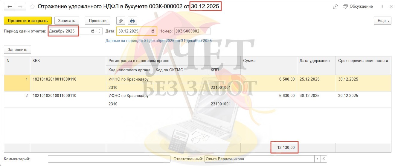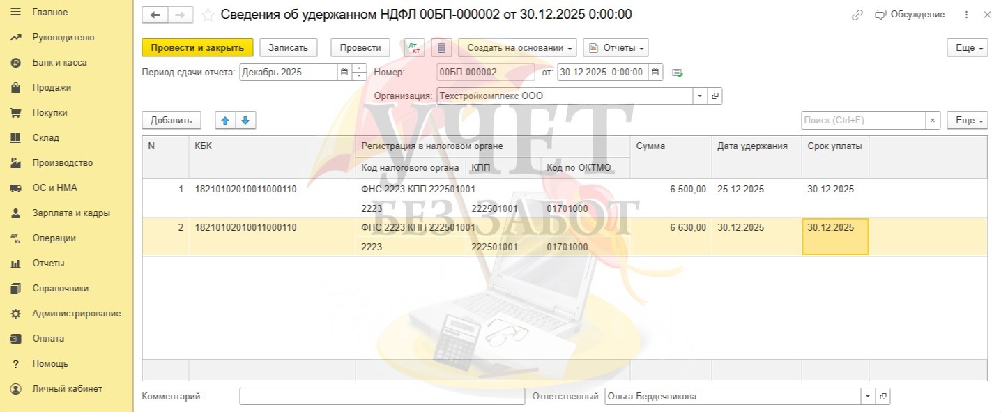Срок сдачи уведомления и уплаты НДФЛ по декабрьской зарплате в нашем случае – 30.12.2025. Взносы на травматизм, а также взносы по единому тарифу, исчисленные с декабрьской зарплаты, подлежат уплате уже в следующем году – 15.01 и 28.01 соответственно.