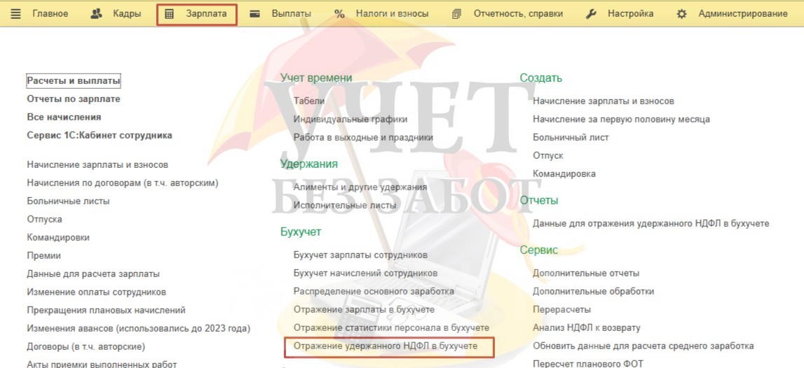 Перейдем в раздел меню «Зарплата» и выберем пункт «Отражение удержанного НДФЛ в бухучете».