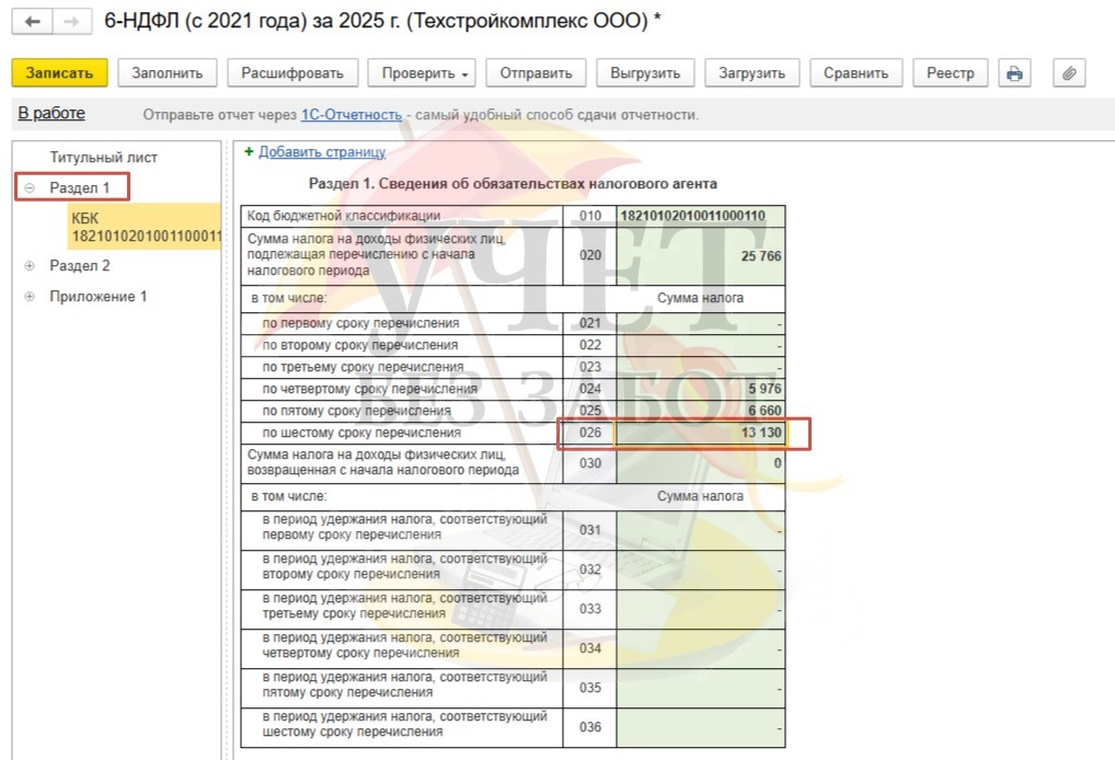 Теперь сформируем 6-НФДЛ. По строке 026 Раздела 1 видим сумму налога, исчисленного с аванса и окончательного расчета по декабрьской зарплате, а также с суммы натурального дохода.