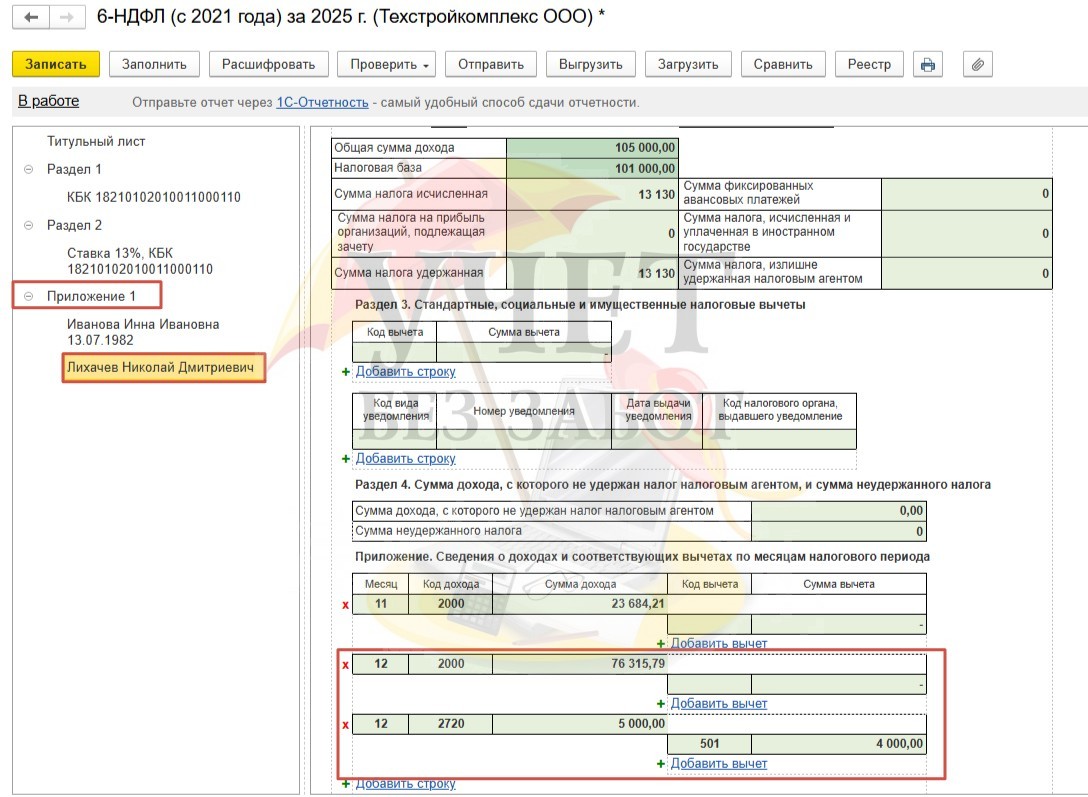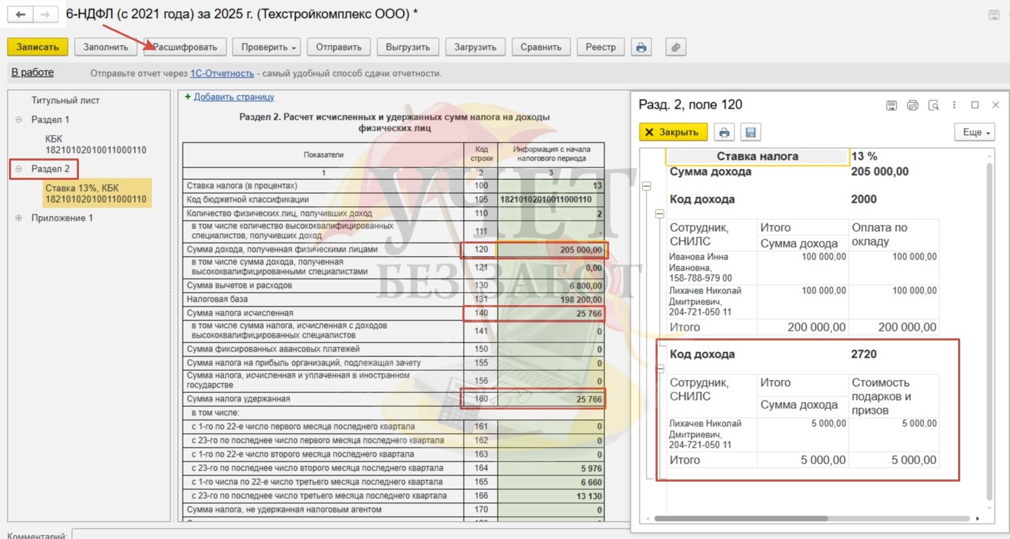 Также обратите внимание на корректность заполнения строк отчета при выдаче подарков. Если в вашем случае подарок стоимостью свыше 4 000 руб. был вручен в декабре, а удержание налога происходит при денежной выплате января, то сумма натурального дохода отражается по строке 120 Раздела 2, а налог, исчисленный с данной суммы – по строке 140 Раздела 2. При этом удержанный налог в отчете за 2025 год не подлежит отражению по Разделу 2.